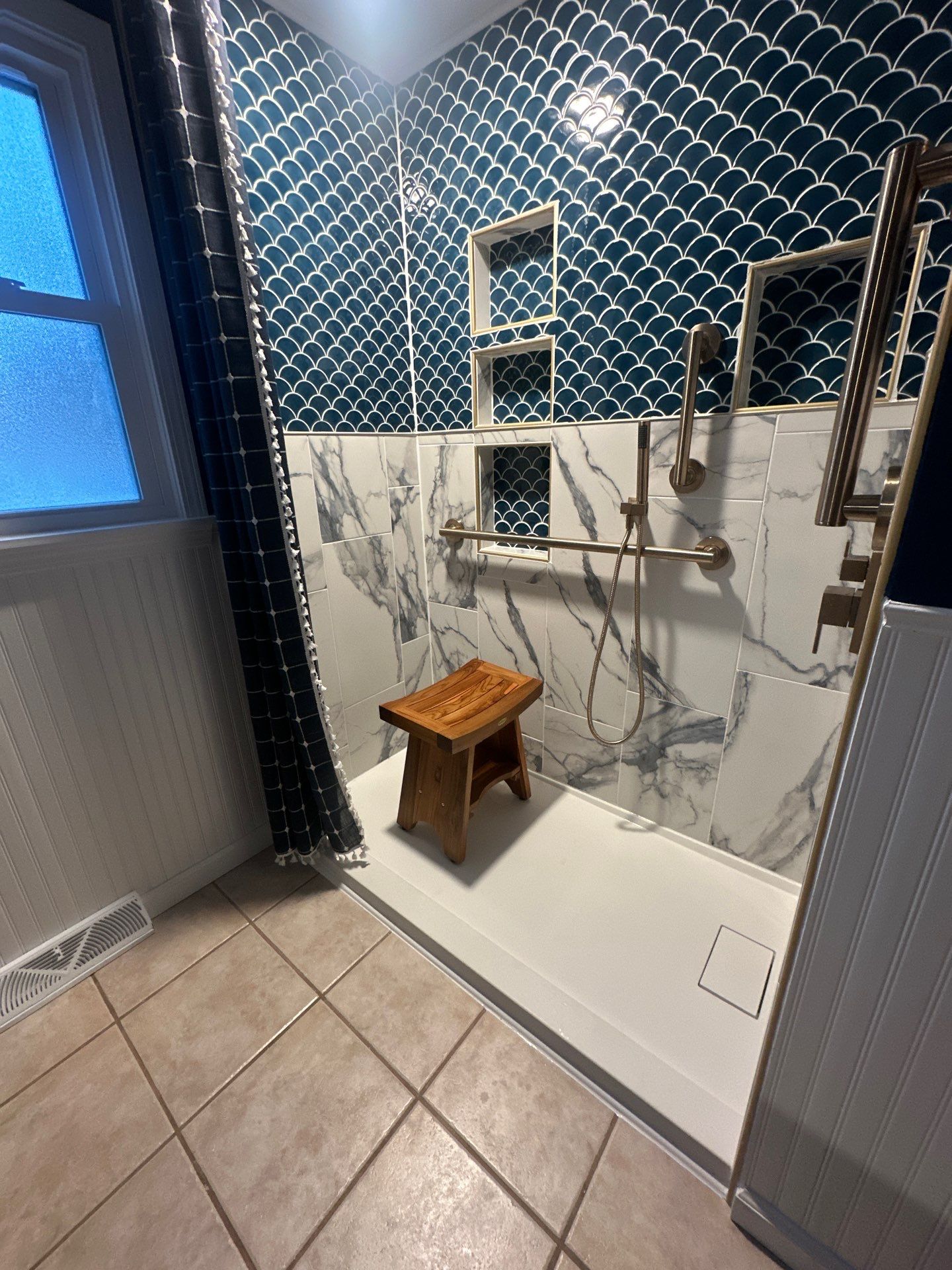 Creating a custom ADA, safe bathroom, adding hidden storage in walls to maximize wheelchair space usage. Custom tile and stone floors installed double vanity with extra lighting.