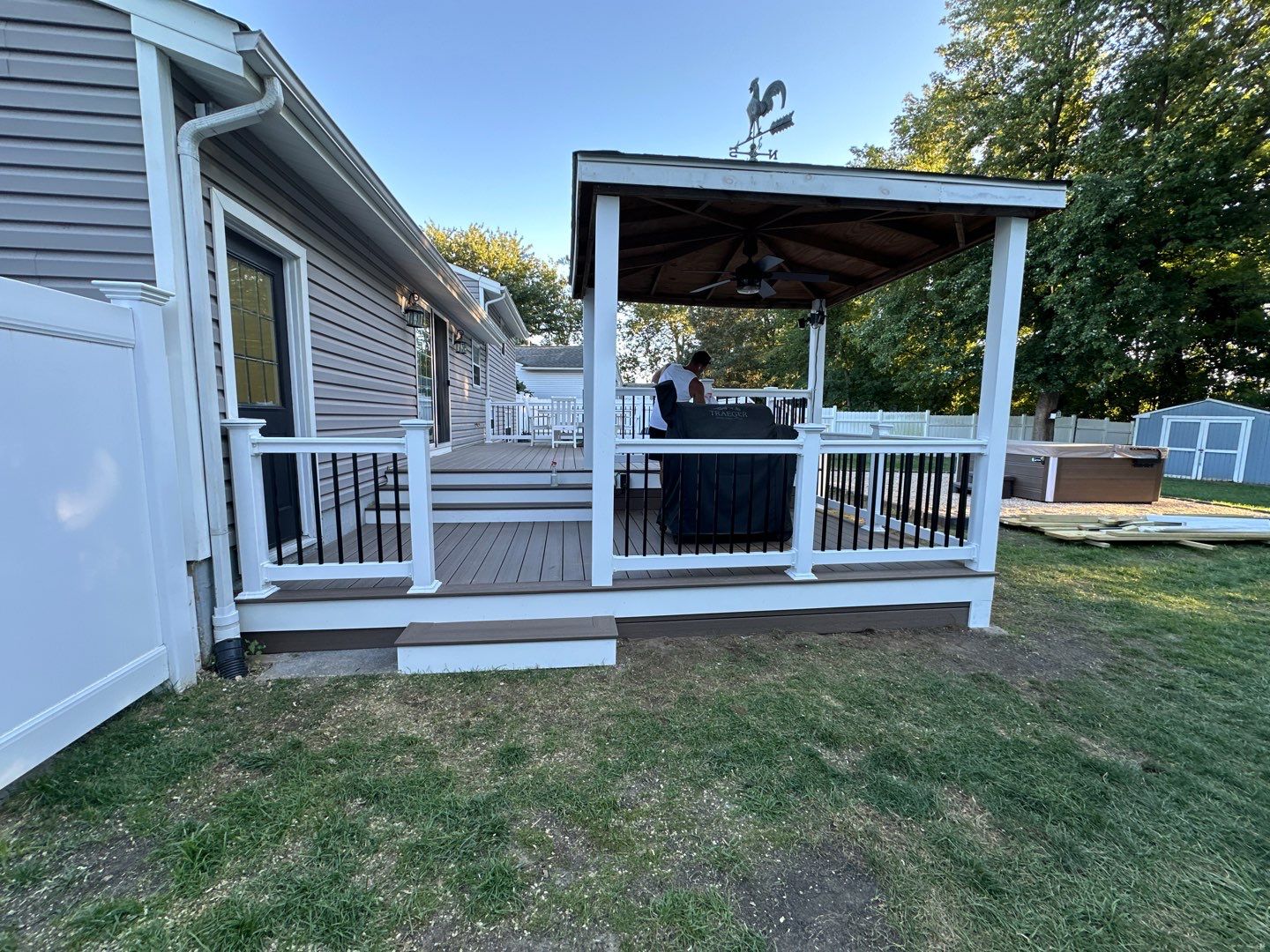 Deckorators Venture - Color Sandbar , White vinyl railings with black aluminum baluster, LED lights, Horizontal Skirting board on board, Deck Resurface