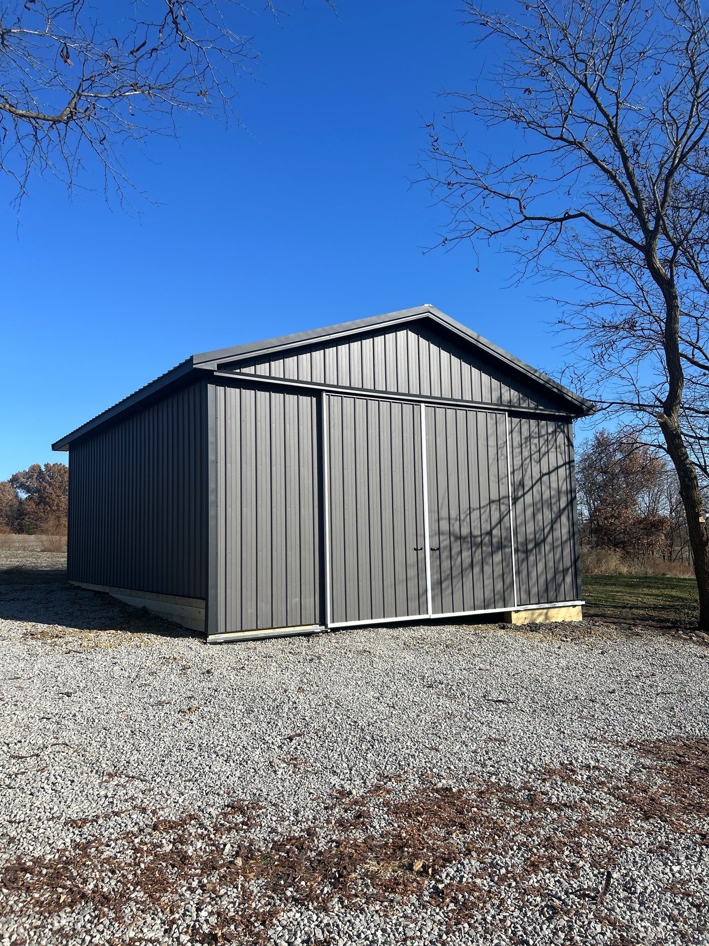 Size: 24'(w) x 28'(l) x 10'(h). Posts: 3-Ply 2x6 Laminated Posts. One Gable Side Open. Trusses: Wood Trusses (4/12 Pitch, 4' O/C). Framing: 2x8 Treated Skirt Boards, 2 x 6 Wall Girts, 2 x 4 Roof Purlins 2’ O/C. 29 ga. Metal