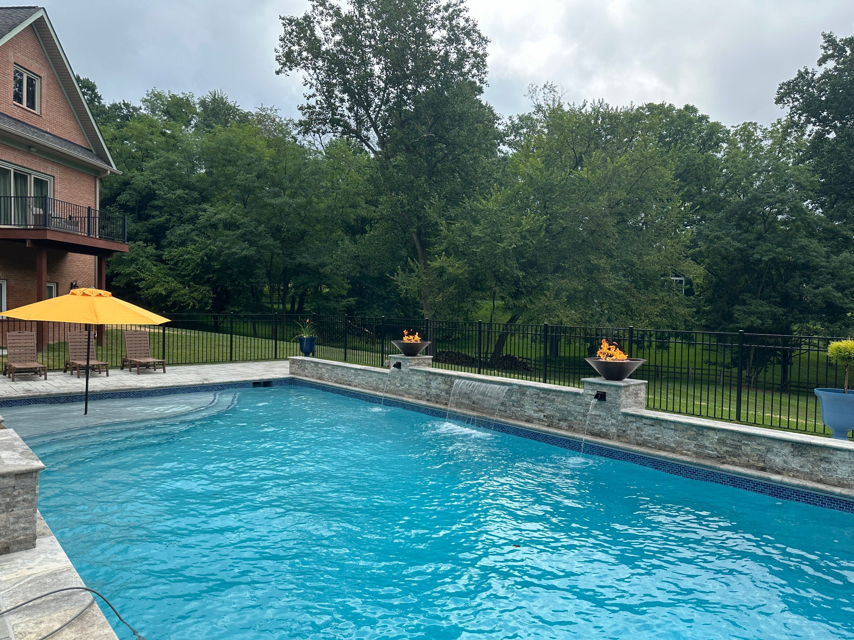 New construction gunite pool with attached raised spa. Also includes fire bowls, scuppers, and waterfall.