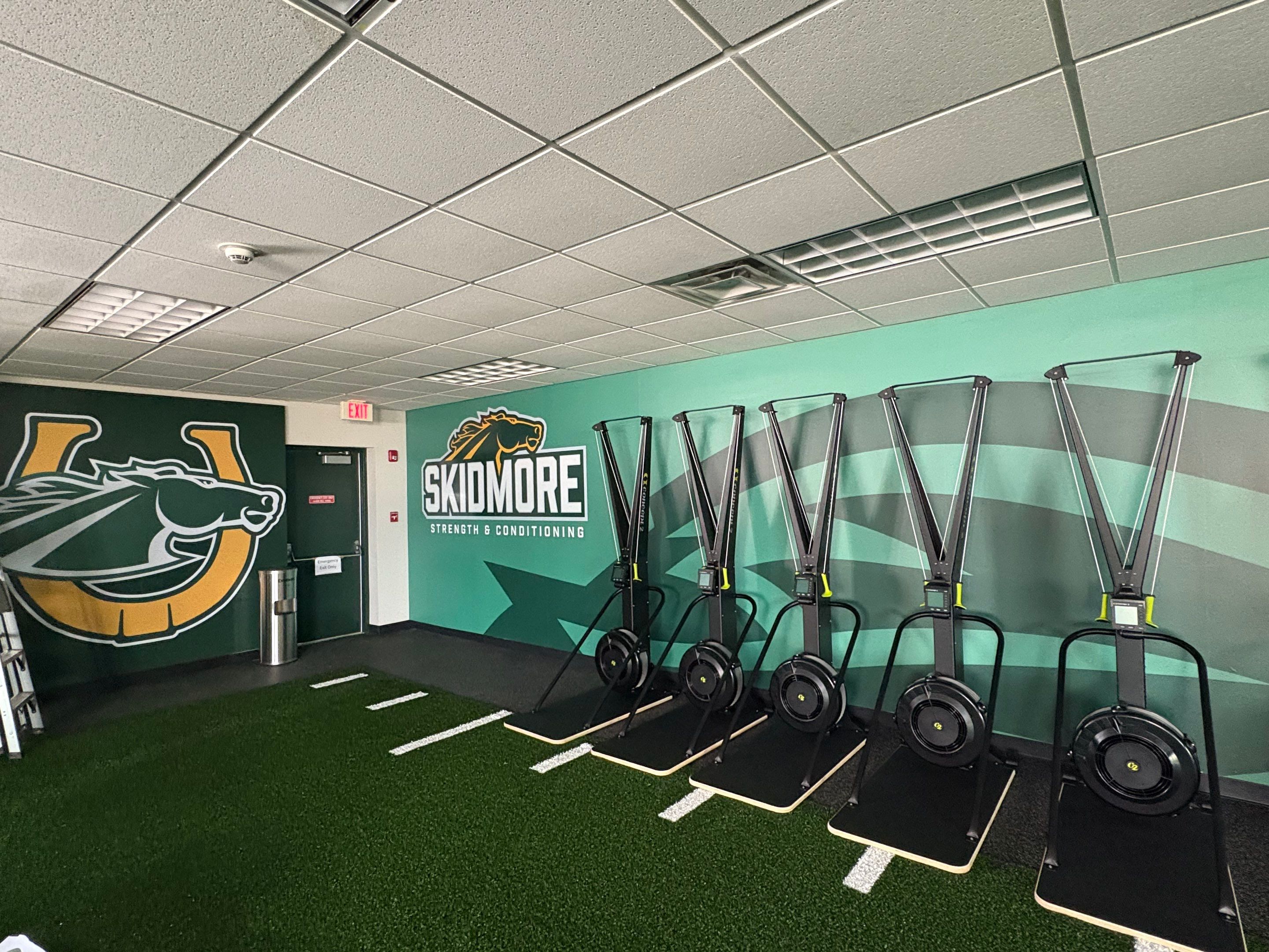 We completed a comprehensive renovation of the Skidmore Varsity Sports Center in Saratoga Springs. This project involved upgrading the interior athletic spaces with new flooring, extensive wall graphics, and specialized equipment installations to enhance training and performance. The facility now features durable green artificial turf flooring with clear white markings, alongside striking custom wall murals that brand the spaces with Skidmore Athletics logos and team colors. We installed a variety of new fitness equipment, including rowing machines, ski ergometers, weight racks, and medicine ball sets, creating a modern and functional athletic environment.