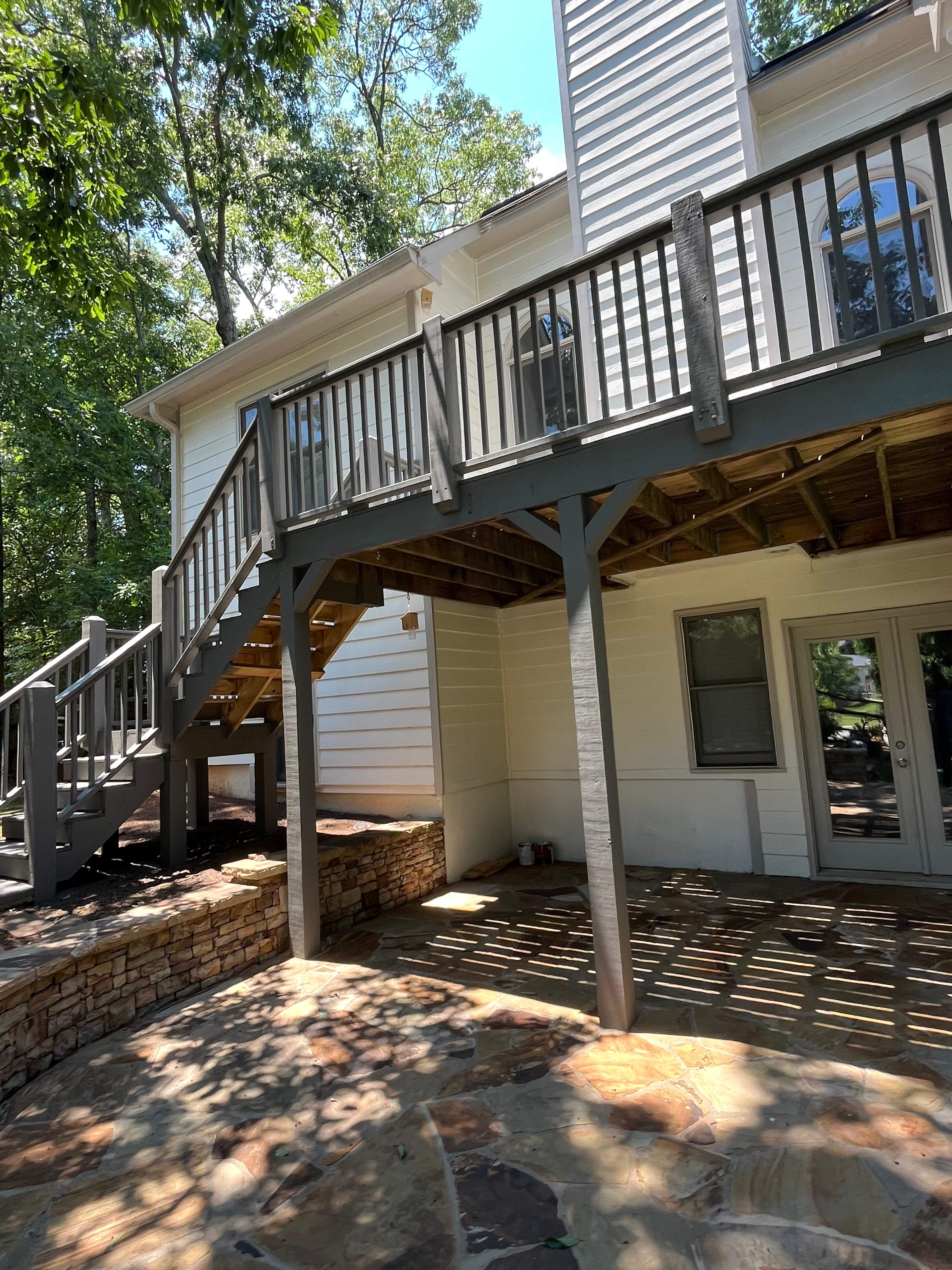 We restored this deck with a full prep and refinish process, starting with a thorough cleaning to remove dirt, mildew, and old failing stain. After allowing proper dry time, we sanded rough areas and addressed any worn or weathered boards to ensure a smooth surface. We then applied a high-quality exterior stain to enhance the natural wood grain while providing long-lasting protection against sun and moisture. The result is a rich, even finish that brings the deck back to life and extends its durability for years to come.