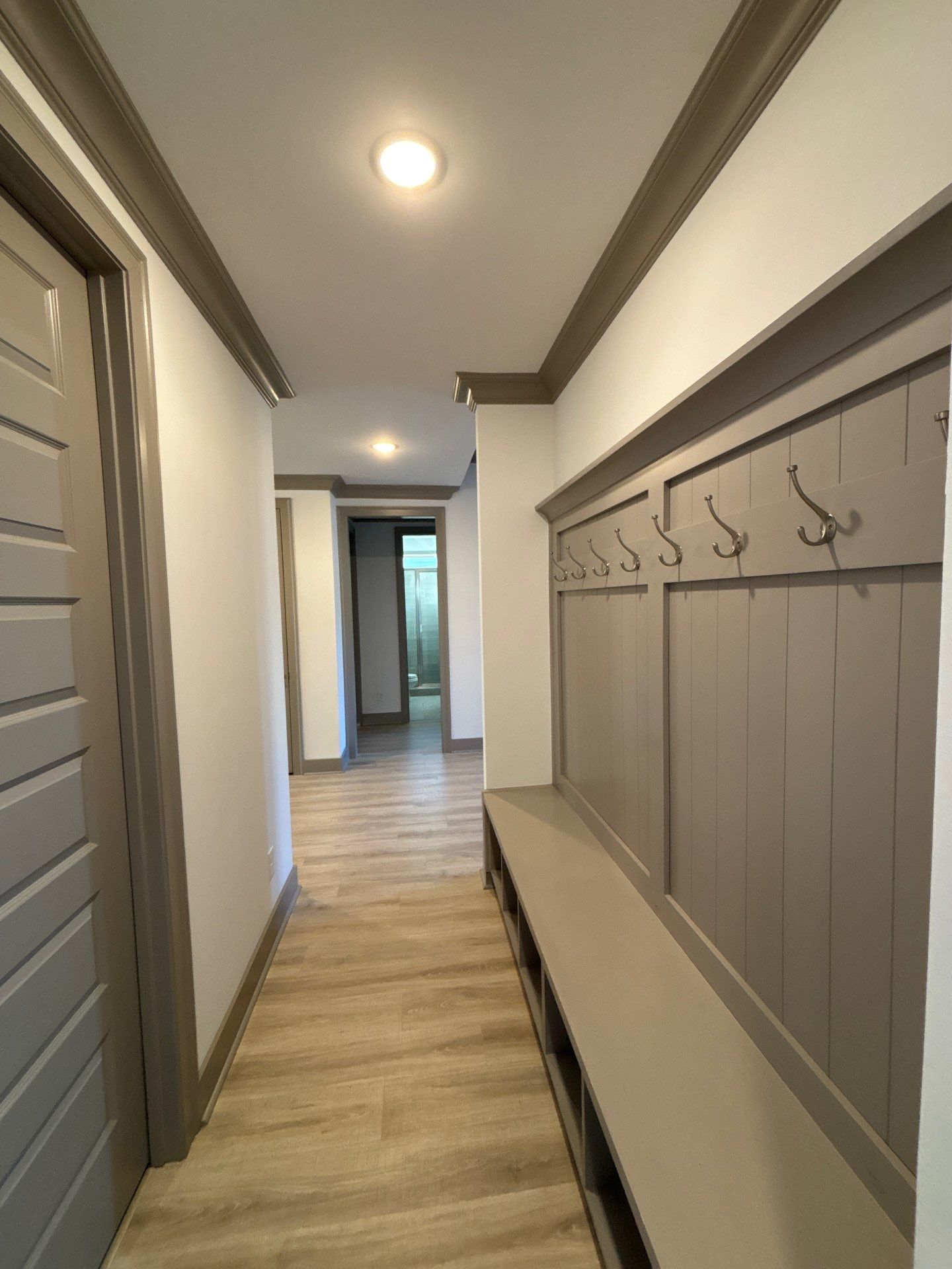 This interior and patio painting project in North Cumming features warm gray trim paired with soft off-white walls. The neutral palette brightened the spaces while creating a clean, cohesive look that flows seamlessly between indoor and outdoor areas.