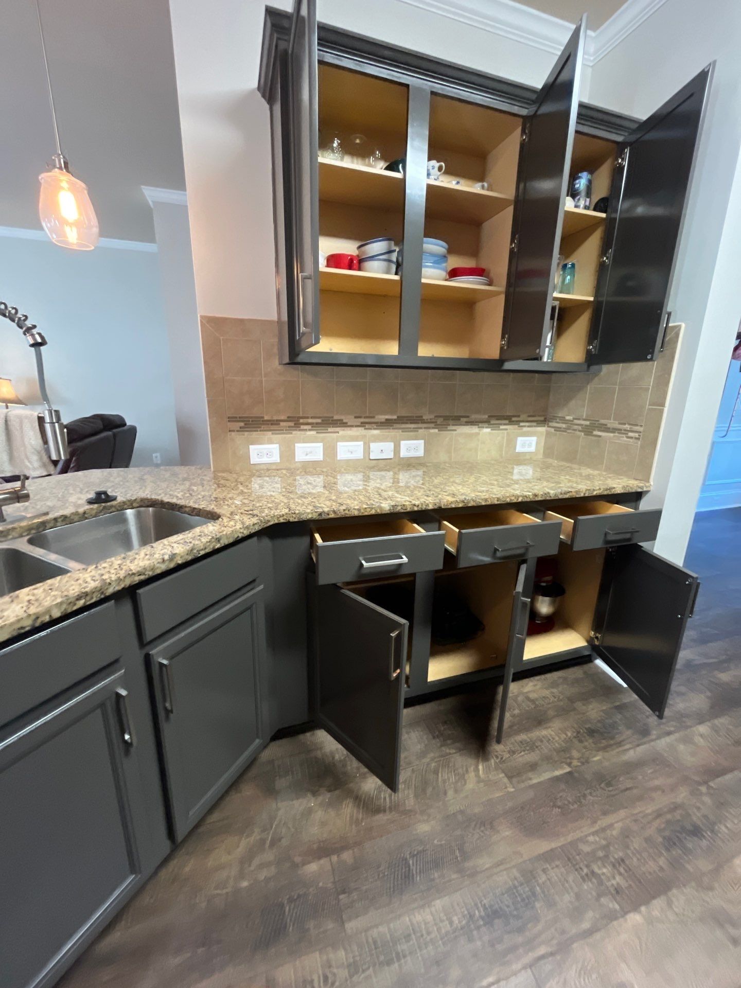 This interior kitchen cabinet repaint in Cumming transformed cabinets from natural wood to a medium gray using Sherwin-Williams. The update modernized the kitchen with a clean, balanced finish, with before-and-after photos available to show the transformation.