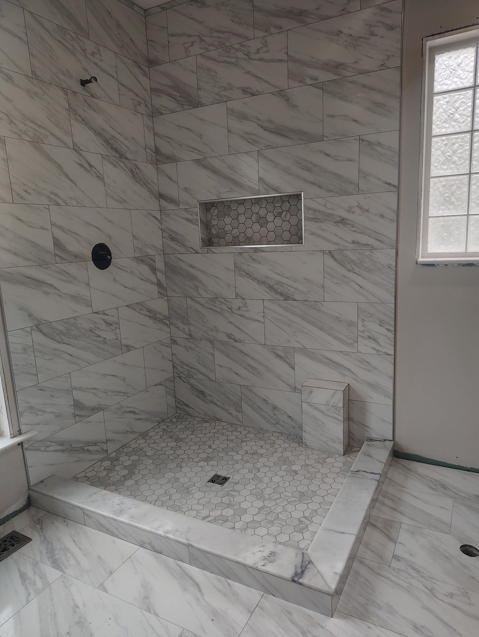 A full bath remodel with large-format white marble tiles on both the floors and shower walls, and matching hexagonal mosaic tiles for the shower pan and niche.