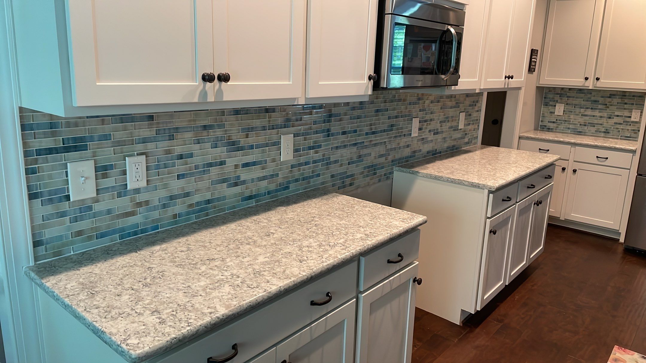 Backsplash to transform the look of this kitchen. Clean lines and easy to clean tile makes clean up easy.