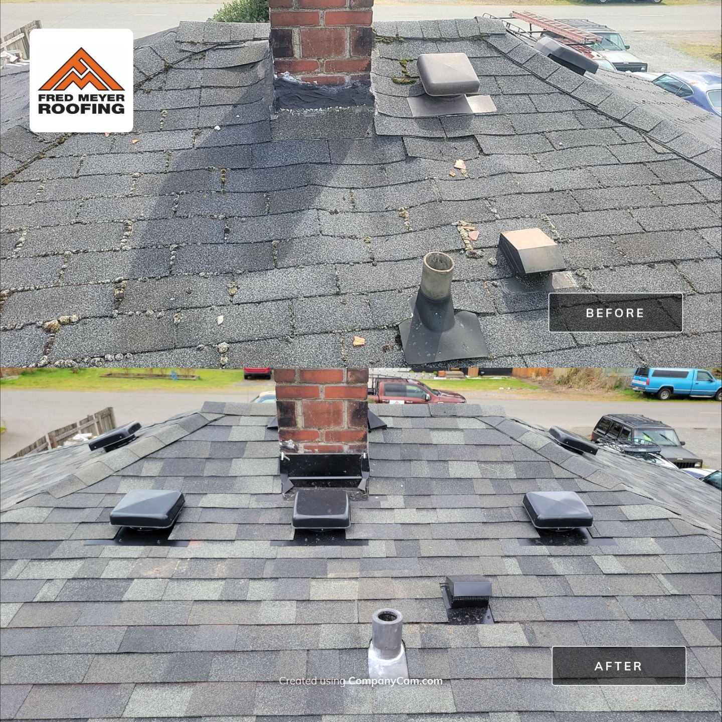 Rotting areas of the roof were a concern, so we replaced the damaged wood and installed a new Malarkey Vista shingle in Storm Grey. Additionally, we counter flashed the chimney to ensure proper water protection and enhance the home's longevity. The finished roof not only looks great but also offers increased durability.