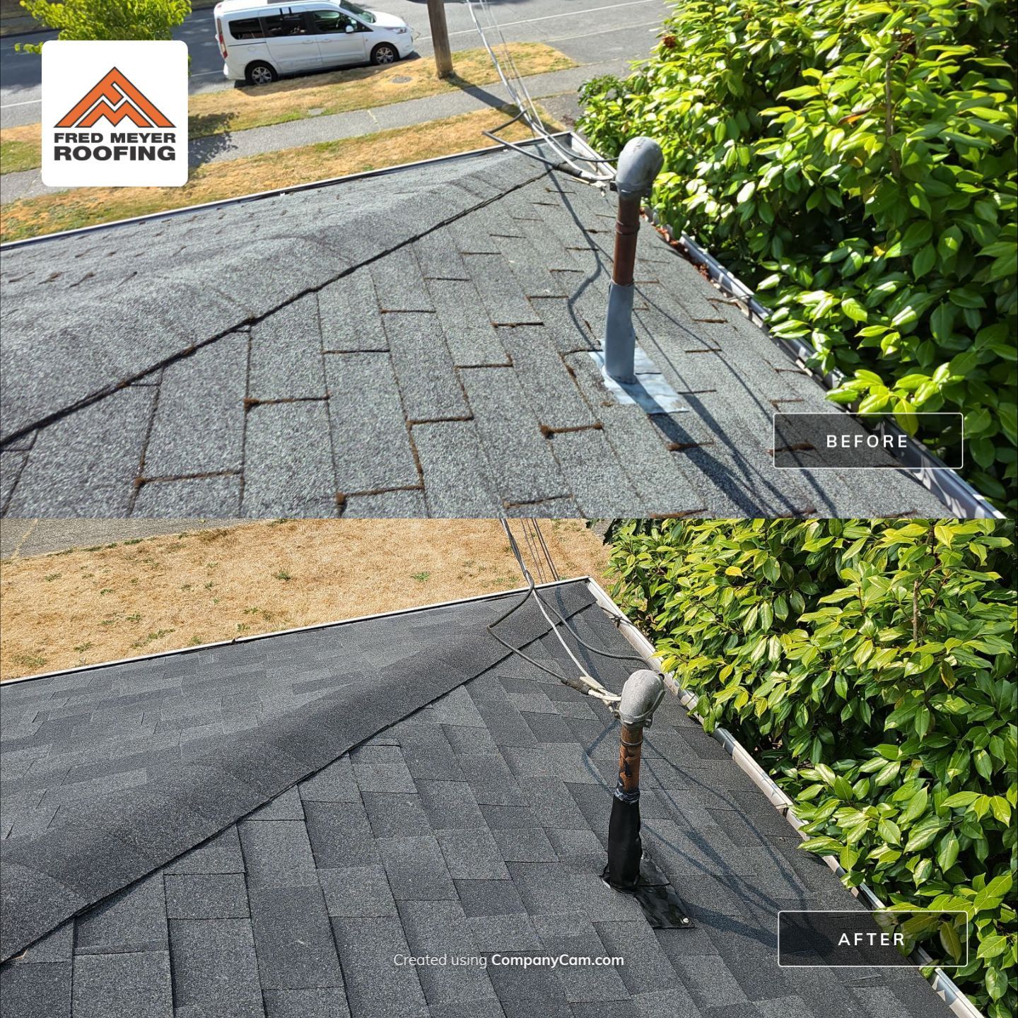 A worn-out roof prompted the need for a complete replacement. We installed high-quality Malarkey Highlander shingles in Midnight Black, enhancing the home's curb appeal. In addition, two new skylights were added to improve natural lighting, alongside the installation of a ridge vent that helps regulate temperature and airflow.