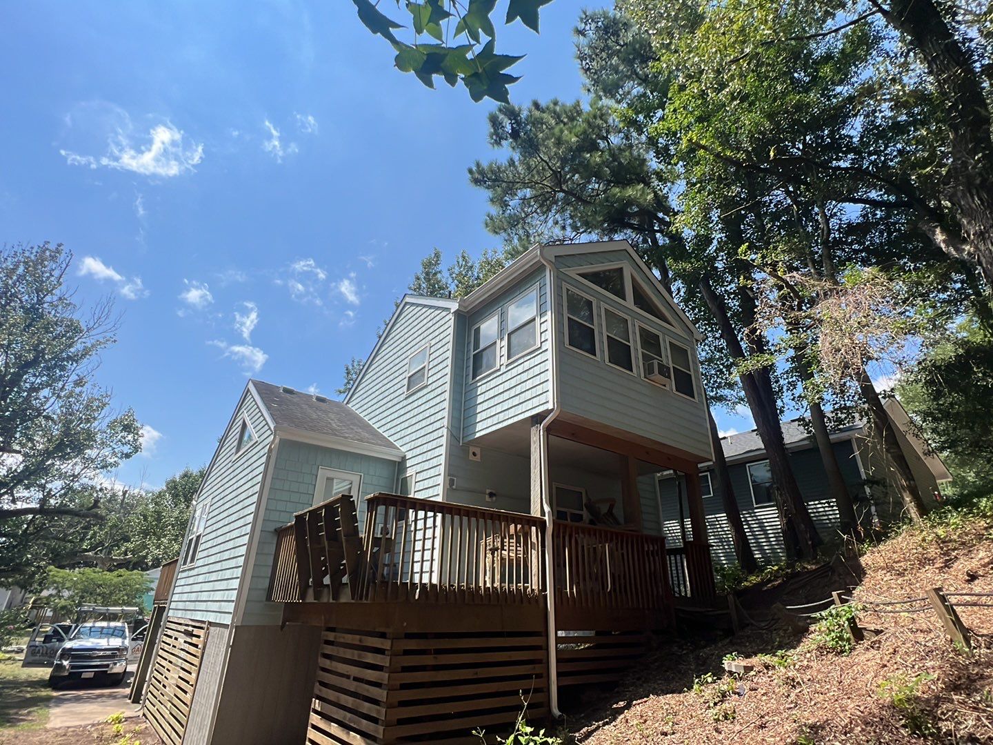 Completed a full siding removal of aged, white cedar shake siding and trim and replaced with Bermuda Blue cedar impressions and new, white LP fascia and soffit. Transforming this home from an aged look to a new, bright, clean and refreshing exterior.