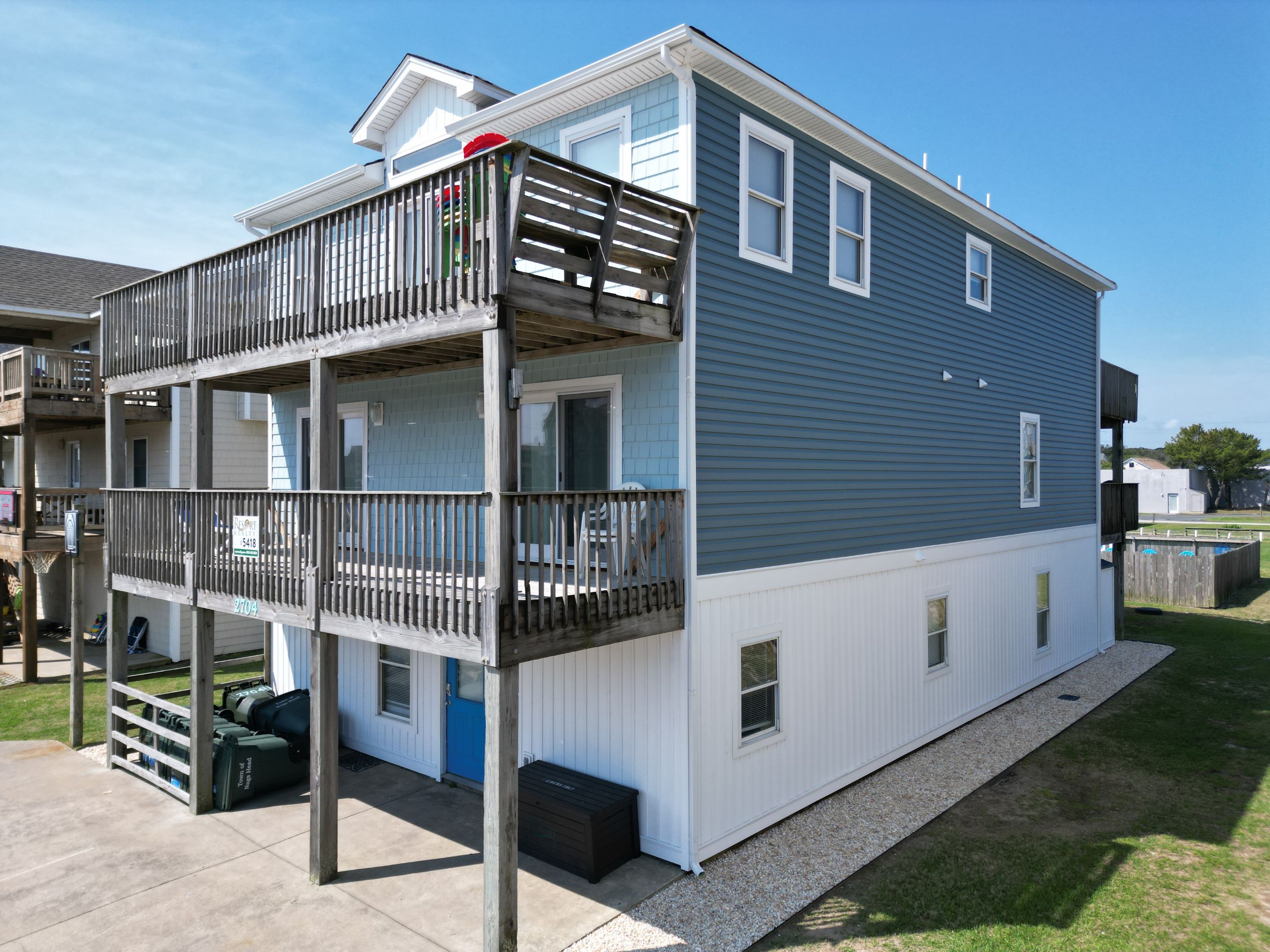 Called out after an incident next door resulted in damaged siding and what could have been a small repair turned into a complete exterior upgrade. Removal of all existing, aged maple vinyl siding and replaced with three different textures to make this home standout of the lineup. Utilizing board and batten on the ground level to give it a clean start, along with a contrasting blue lap siding on the north and south allowed the Bermuda Blue cedar impressions to pop off the front of the home. Included was a full PVC trim package along with new vinyl soffit and aluminum fascia. The transformation truly makes this home stand out in the mix of all the tan and yellows along this row of homes.