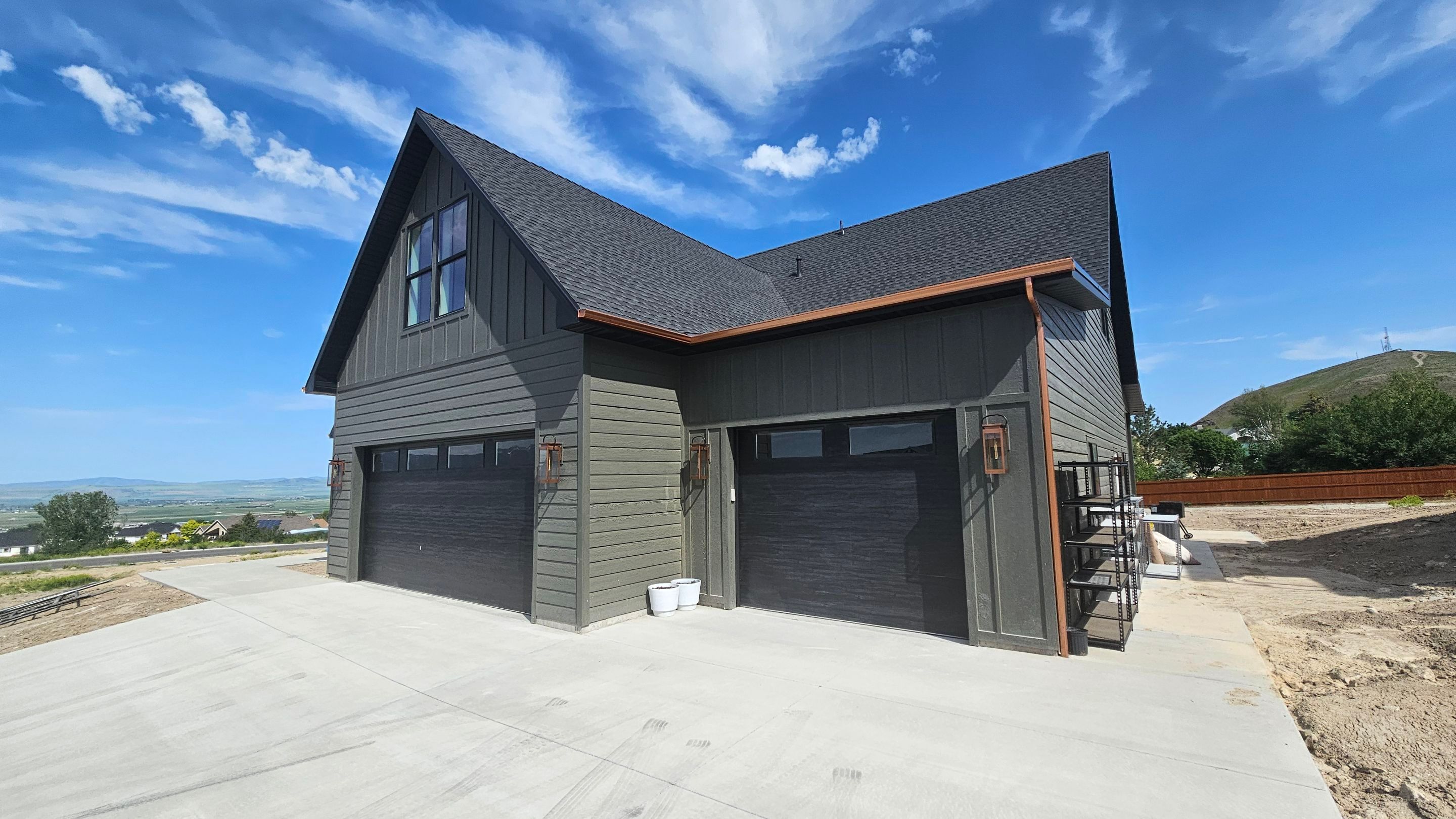 LP Smartside on the entire house. Chain for the front downspouts. Copper plated gutters on the front of the house. Cedar T&G on the back patio soffit.