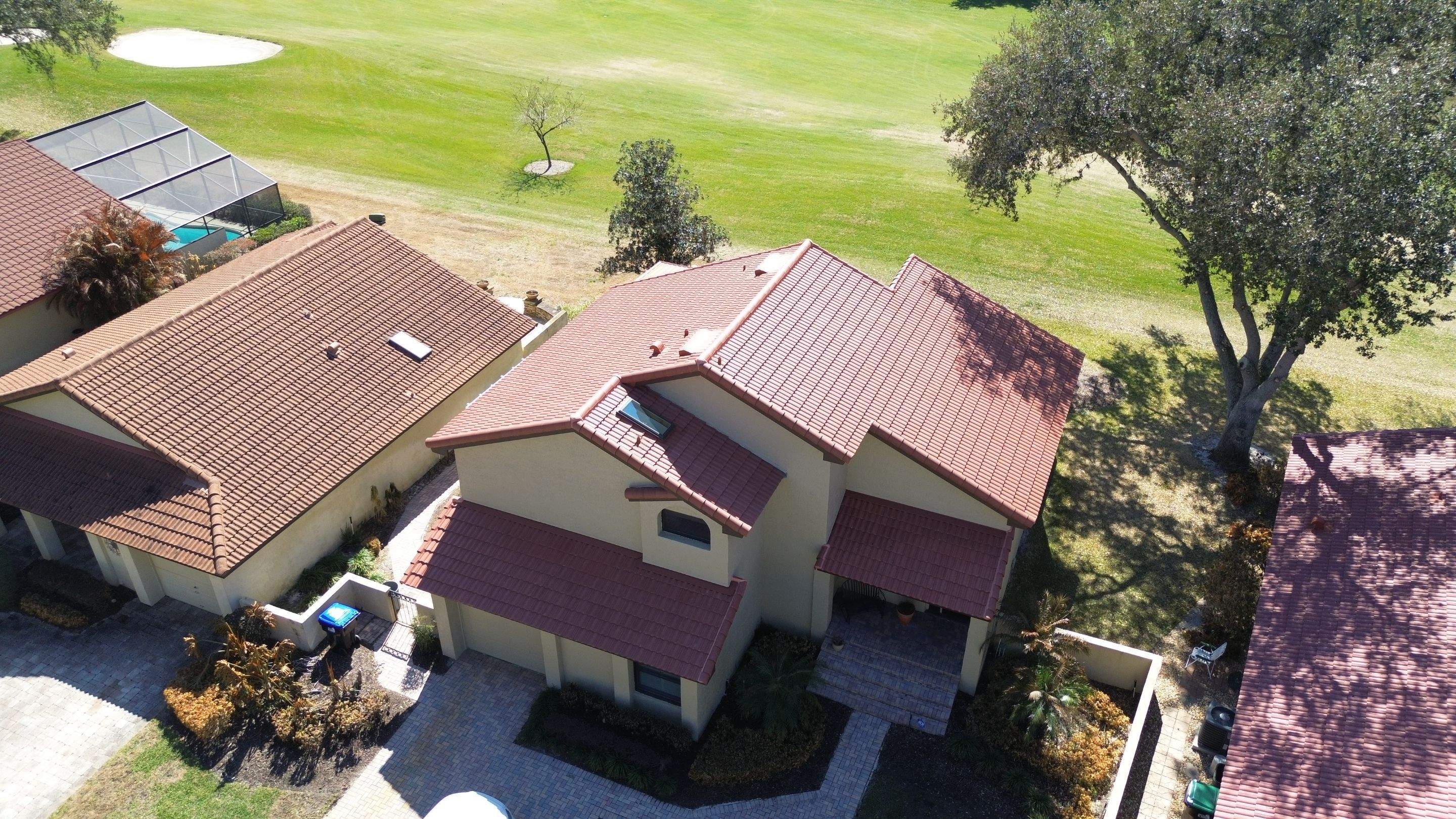 This home features a professionally installed concrete tile roofing system in a classic terracotta finish, delivering both durability and timeless curb appeal. The roof showcases a clean, uniform layout with precision-aligned horizontal tile courses and properly installed hip and ridge caps for enhanced weather protection and structural integrity. The multi-faceted roof design includes several hips and valleys, all expertly integrated to ensure proper water shedding and long-term performance. The consistent color tone across all slopes highlights the quality of the tile installation and attention to detail. Roof penetrations, including vents and a skylight, are neatly flashed and seamlessly incorporated into the system for a watertight seal. Concrete tile roofing is known for its longevity, wind resistance, and energy efficiency—making it an excellent choice for Florida and coastal climates. This installation not only enhances the architectural style of the home but also provides superior protection against harsh weather conditions.