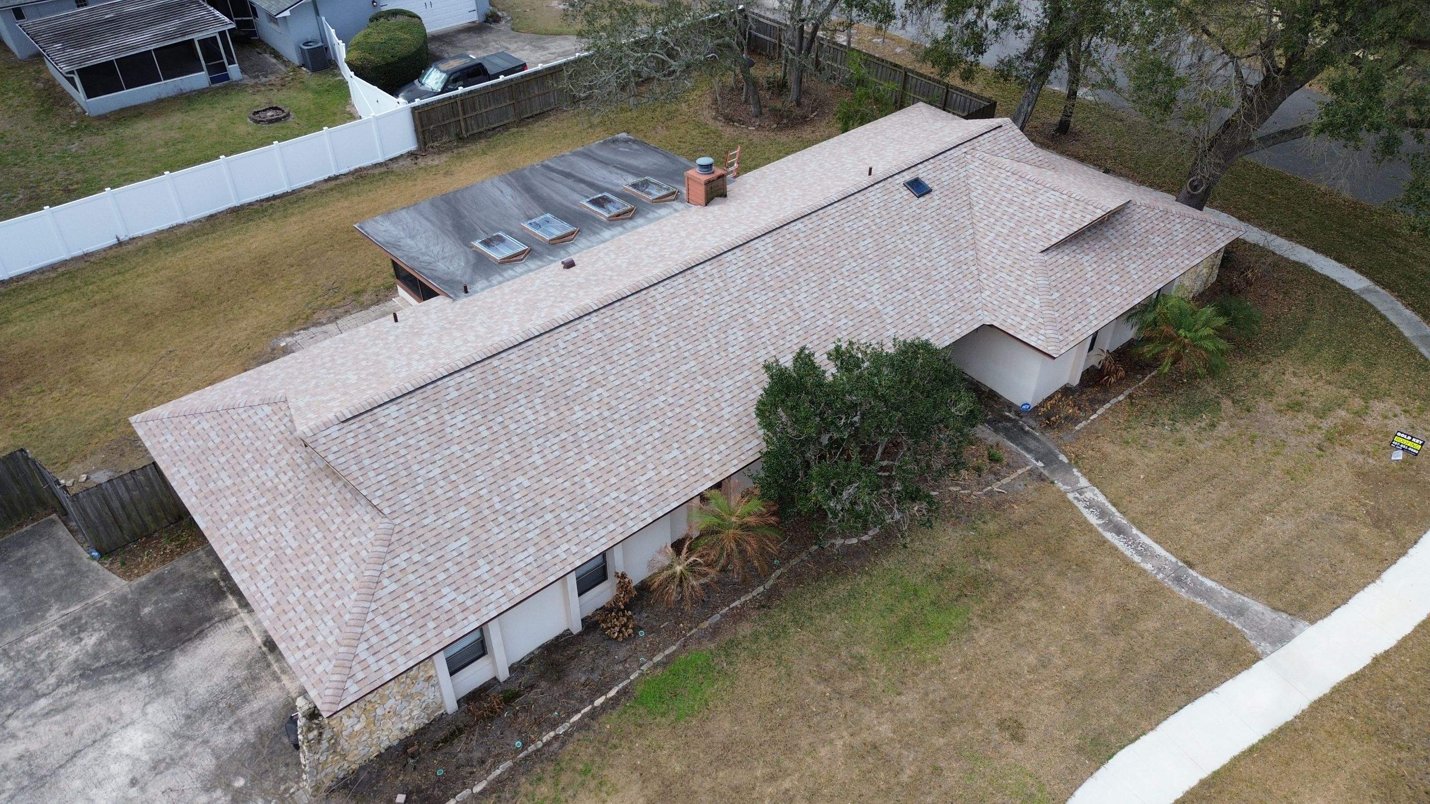 This project showcases a professionally completed architectural shingle reroof installation, delivering enhanced durability, weather protection, and improved curb appeal. The primary roofing system features dimensional asphalt shingles in a light weathered wood/tan blend, providing a clean, uniform appearance with strong shadow lines and visual depth. The consistent course alignment and straight ridge detailing reflect precise installation standards and attention to craftsmanship. Key components of the reroof include: Complete tear-off of existing roofing materials Installation of new underlayment for improved moisture protection Architectural (dimensional) asphalt shingles for long-term performance Matching ridge cap shingles for reinforced ridge protection Properly flashed roof penetrations and ventilation components Clean transitions between roof planes and adjoining low-slope section The property also includes an adjacent low-slope modified or membrane roofing section with integrated skylights and metal flashing, properly tied into the new shingle system to ensure watertight performance at all transition points. Overall, this reroof project delivers a structurally sound, aesthetically cohesive roofing system designed to provide reliable protection, balanced ventilation, and lasting value for the homeowner.