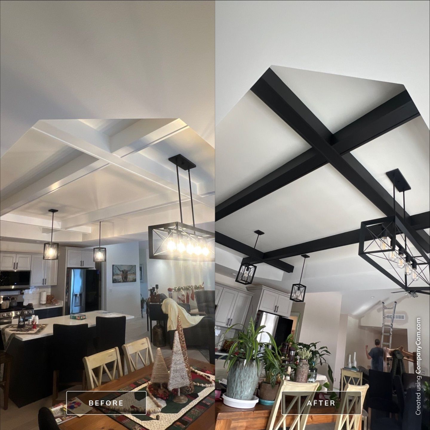 Check out this interior repaint. We did all 1st floor walls, and also added some character to a kitchen by painting some beams black!