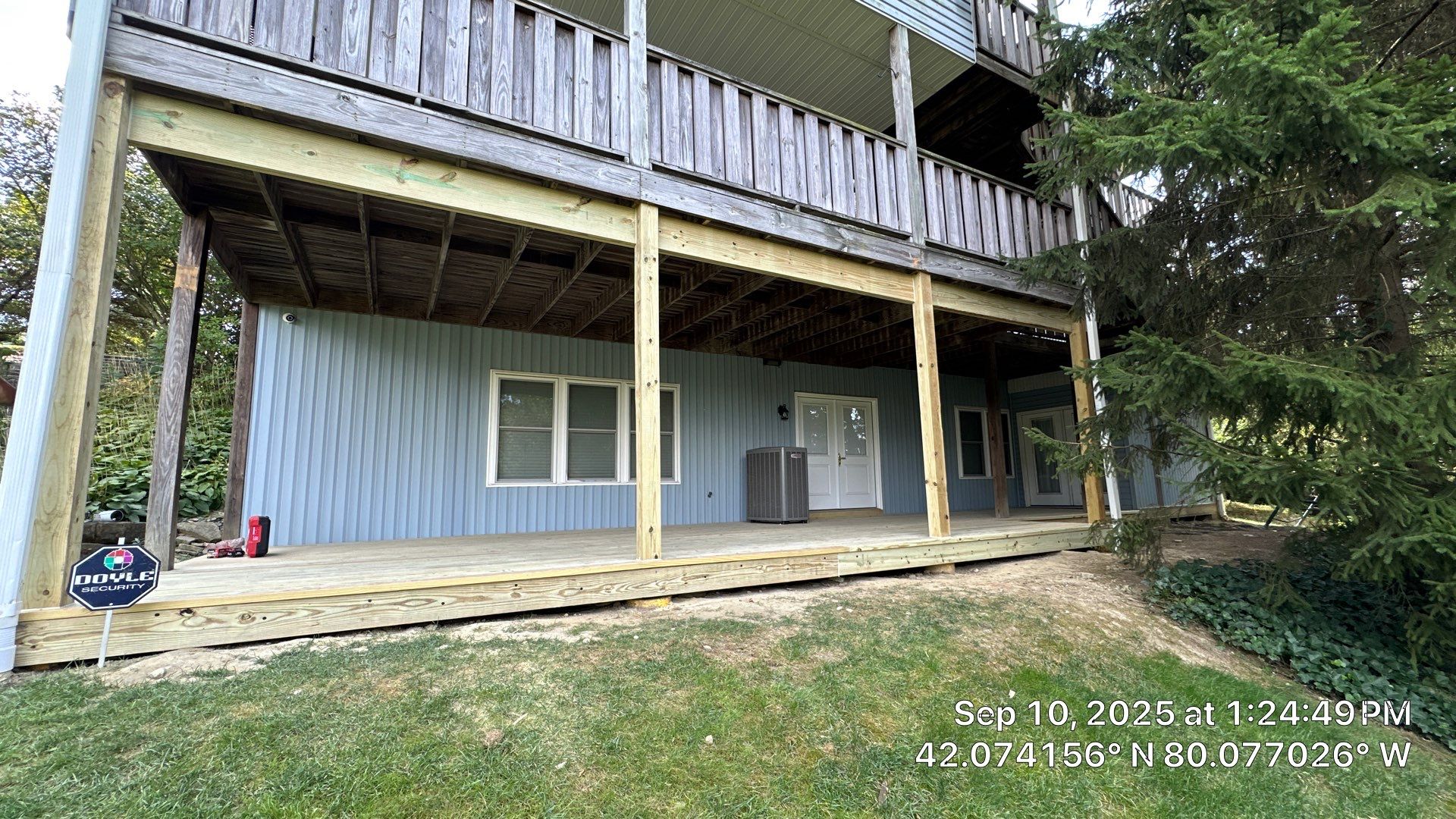 Customers lower deck began to collapse due to improper ledger fastening to the homes structure and due to improper footings for the 6x6 supports. We temporarily supported the upper decks and third floor addition, completely removed the lower decking and structure framing, removed the existing 6x6 support posts, dug out and installed 12"x4' SonoTube concrete support columns, installed support ledgers under 2nd story deck framing, installed all new support framing for first floor decking and installed all new 2x6 floor decking.
