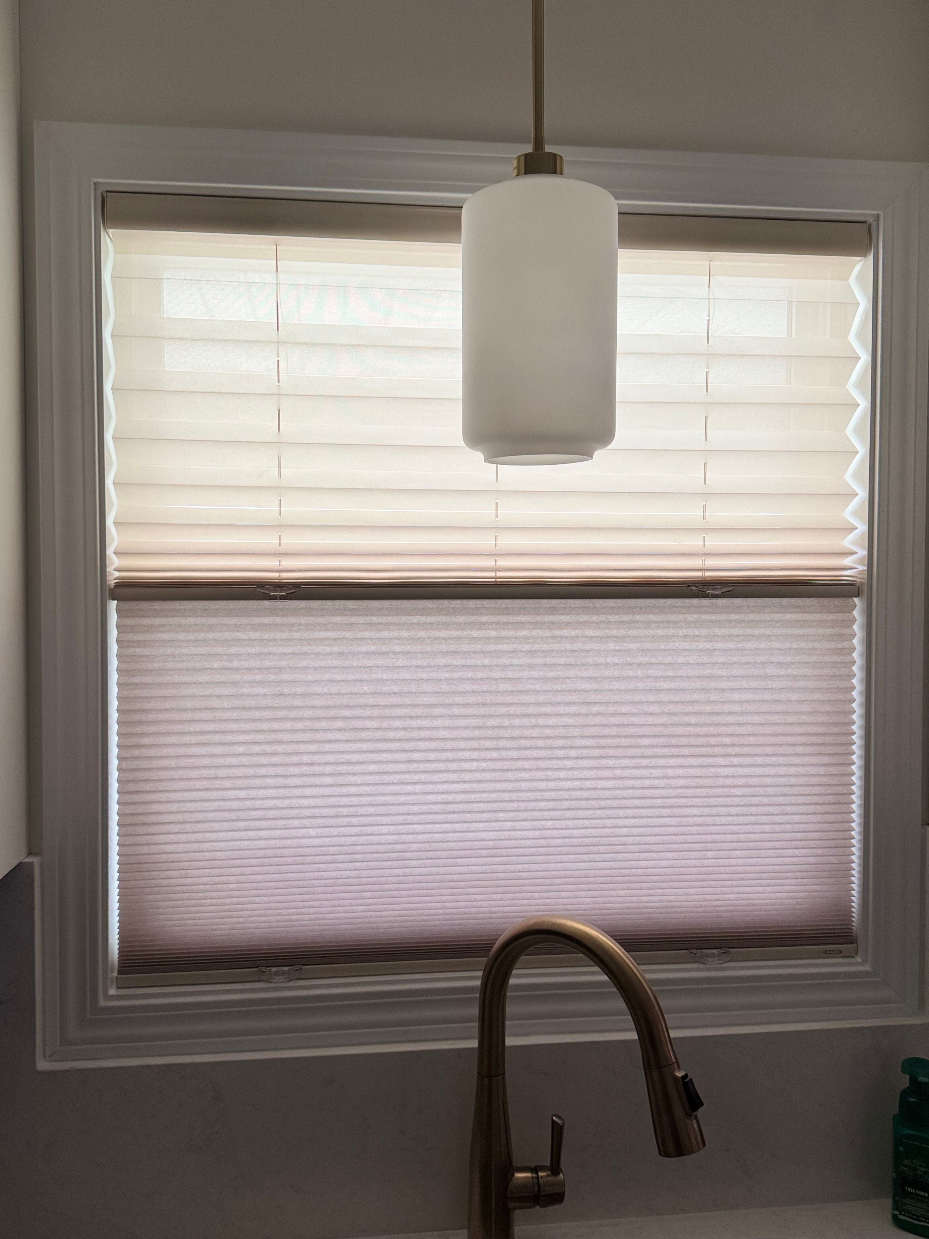 These cellular shades are a combination of a 3/4" single cell bottom shade with a 2" pleated shade on top. This gives you ultimate flexibility and privacy day or night.