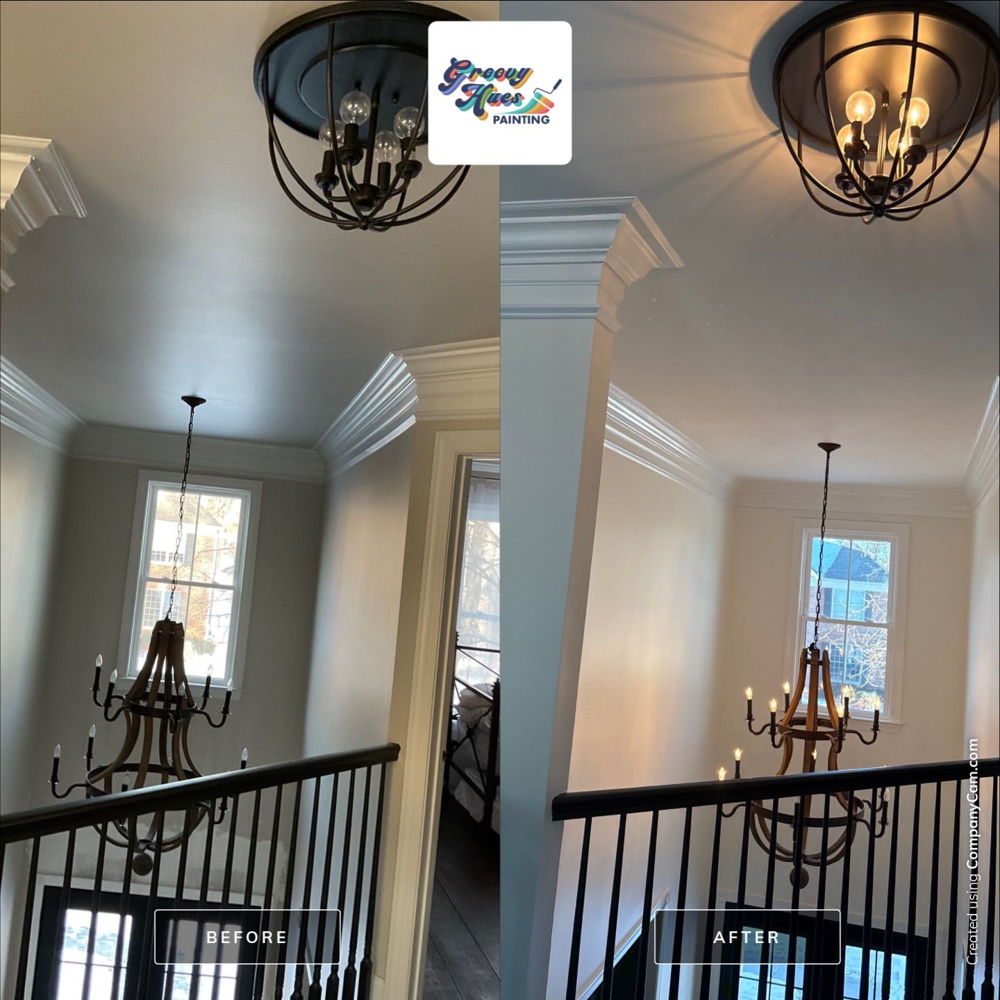 This project focused on creating a light, cohesive feel across the main living areas and connecting spaces of the home. Our crew, led by Mynor, refreshed walls, ceilings, and trim throughout multiple rooms, resulting in a clean, polished look that feels open and welcoming from the moment you walk in. Interior Highlights Foyer, Living Room, and Hallway: Walls throughout these spaces were prepped, patched, sanded, and painted with Sherwin-Williams Alabaster SW7008 (eggshell). This soft, warm white brightens the home while still feeling comfortable and inviting. Ceilings were finished with Sherwin-Williams Promar Ceiling Paint in Alabaster SW7008 (flat) for a smooth, even appearance that helps the rooms feel taller and more open. Crown molding, chair rail, baseboards, window frames, and door frames were carefully detailed in Sherwin-Williams Emerald Urethane Enamel Pure White SW7005 (semigloss), adding crisp definition and durability. Stairwell: Stairwell walls were painted in Alabaster SW7008 (eggshell) to keep the transition space bright and cohesive. Base trim and framing were completed in Pure White SW7005 (semigloss) for a clean, finished look in this high traffic area. Additional Rooms and Window Frames: Window frames throughout the primary bedroom, front bedroom, back bedroom, hallway bathroom, kitchen, office, dining room, family room, basement, and powder room were prepped and repainted in Pure White SW7005 (semigloss). This consistent trim color ties the entire home together and gives each room a polished, well maintained appearance. Preparation and Craftsmanship All work followed Groovy Hues’ No Liquid Rule, with full protection of floors, furniture, and surrounding surfaces before painting began. Walls, ceilings, and trim were patched, sanded using dust controlled systems, caulked, and painted with two coats of premium Sherwin-Williams products. Mynor completed a final walkthrough to ensure clean lines, smooth finishes, and a result that feels cohesive and thoughtfully finished. ✨ This project highlights how a well chosen white palette and detailed trim work can refresh a home and make every space feel brighter and more connected.