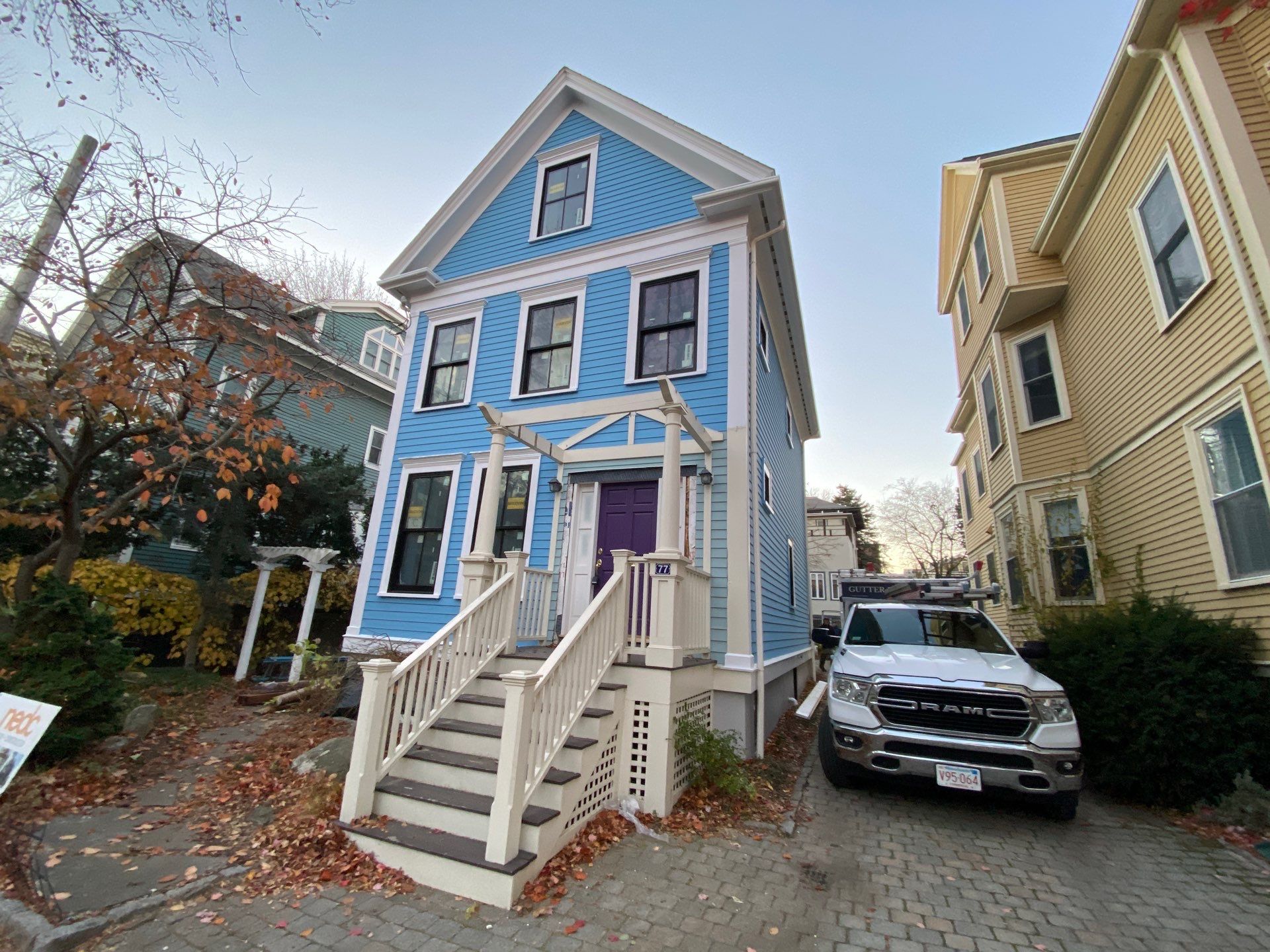 4x5" fiberglass gutter installation in Cambridge, MA, paired with 3” round corrugated aluminum downspouts in eggshell.