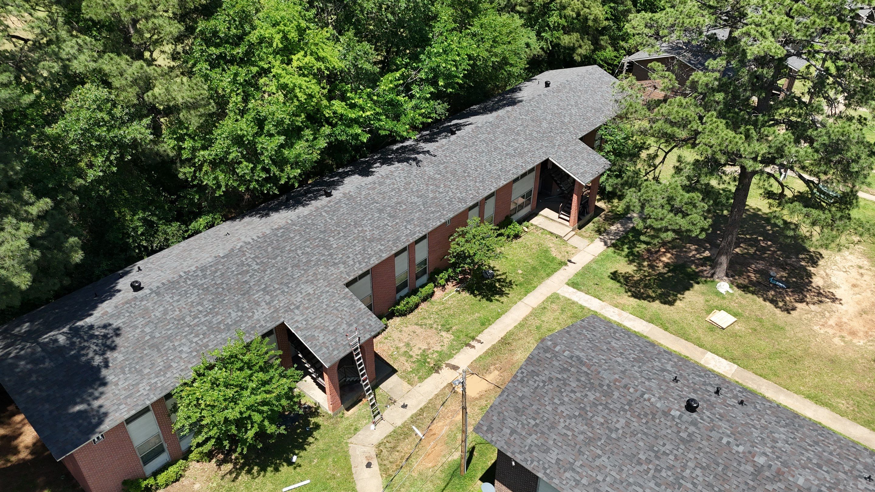 For this job we removed one layer of existing shingles and underlayment down to the bare roof decking. Any damaged decking was replaced as needed, per building. We then installed synthetic underlayment, new ventilation, new vinyl pipe boots, and new residential eave trim galvalume, and finished the roof with Class 3 impact-rated Malarkey Highlander architectural shingles.