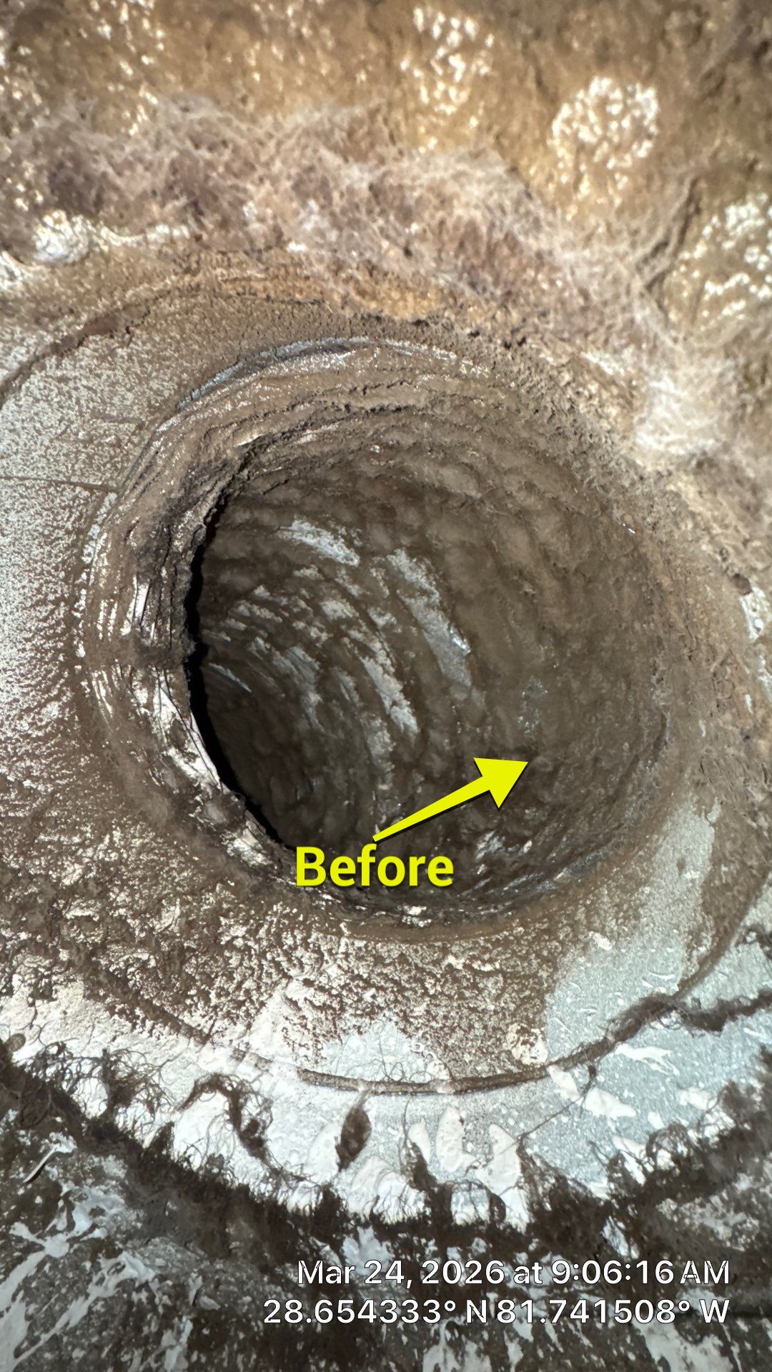 We completed a full air duct and dryer vent repair at a residence in Clermont. During our inspection, we identified significant dust and suspect growth accumulation inside the air handler unit. Using our high-powered vacuum truck, we removed the majority of debris, restoring clean airflow throughout the system. Before-and-after photos clearly demonstrate the effectiveness of our equipment. To ensure optimal suction and protect the home during service, we sealed off vents as needed. This step also helped contain dust and maintain a clean environment throughout the process. While in the attic, we discovered the dryer vent pipe had fully disconnected from the roof. We reattached it using a plate and collar, then sealed the connection with mastic to ensure long-term durability and prevent future separation. Additionally, we sanitized the air handler unit using Decon 30 to help reduce microbial presence and improve indoor air quality. For best results, we recommend servicing air ducts every three years. Routine maintenance enhances airflow, supports healthier indoor environments, and helps prevent dust buildup.