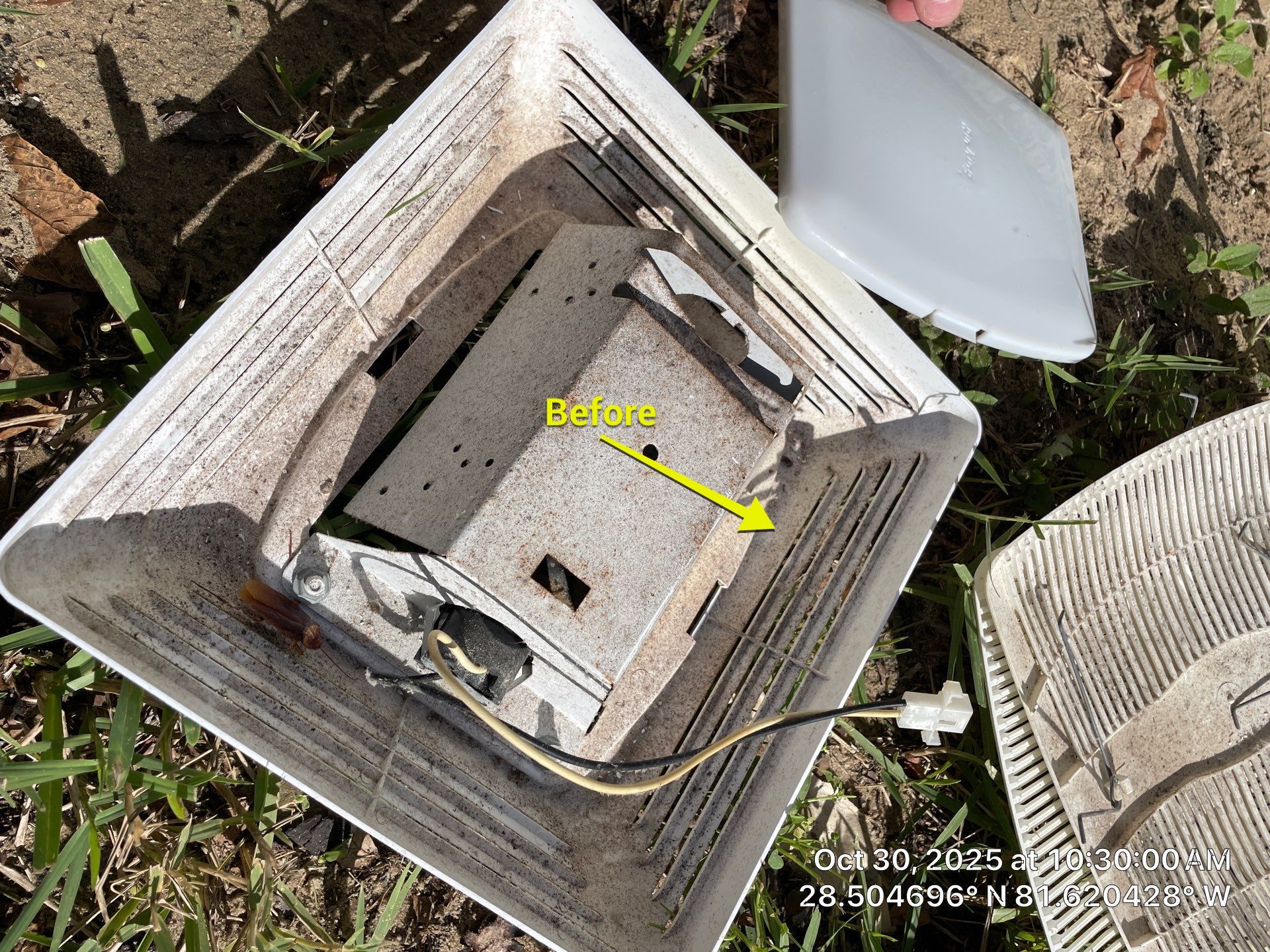 Our team performed a dryer vent cleaning at a home in Winter Garden. Upon arrival, we identified that five bathroom exhaust fans also required attention due to visible dust and debris buildup on the fan units and covers. The dryer vent showed a moderate accumulation of lint, which we thoroughly removed using our high-pressure cleaning system. For the exhaust fans, we removed each cover, cleaned both the fan components and the covers, and reinstalled them to restore proper ventilation. Before-and-after photos were provided to demonstrate the effectiveness of our cleaning process. Since most Florida homes vent through the roof, we recommend annual dryer vent and exhaust fan cleaning to promote better airflow, reduce fire risk, and optimize drying performance.
