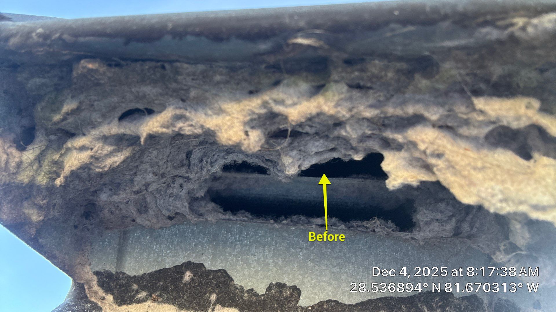 During a recent service in Clermont, our team addressed a significant lint buildup in the rooftop dryer exhaust vent. This type of obstruction can severely restrict airflow and poses a heightened fire risk if not properly maintained. Using our high-pressure compressed air system, we thoroughly cleared the entire exhaust line of lint, debris, and any nesting materials. This restoration of airflow improves dryer performance, increases energy efficiency, and helps reduce utility costs. To highlight the results, we provided before-and-after photos showcasing the effectiveness of our cleaning process. Because most Florida homes vent dryers through the roof, we strongly recommend annual dryer vent cleaning to maintain safety, optimize appliance performance, and prevent costly repairs.