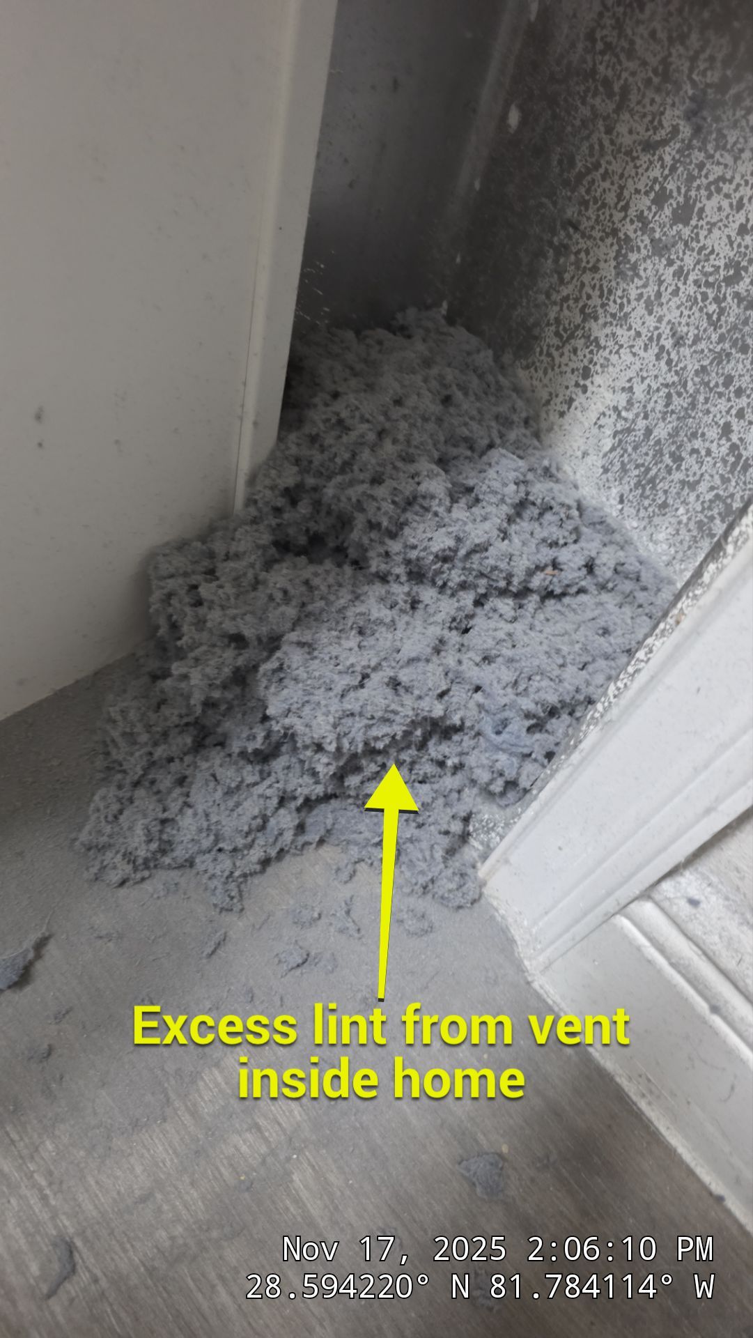Our team completed a dryer vent cleaning at a home in Clermont, where we found significant lint buildup at the rooftop exhaust vent. This type of accumulation can severely restrict airflow and poses a heightened fire risk if not properly addressed. Using our high-pressure compressed air system, we thoroughly cleared the entire exhaust line of lint, debris, and any nesting materials. This service restored optimal airflow, improved dryer performance, and can help reduce energy consumption. We provided before-and-after photos to clearly show the results of our cleaning process. We recommend scheduling dryer vent cleaning annually to maintain safe airflow and minimize fire hazards