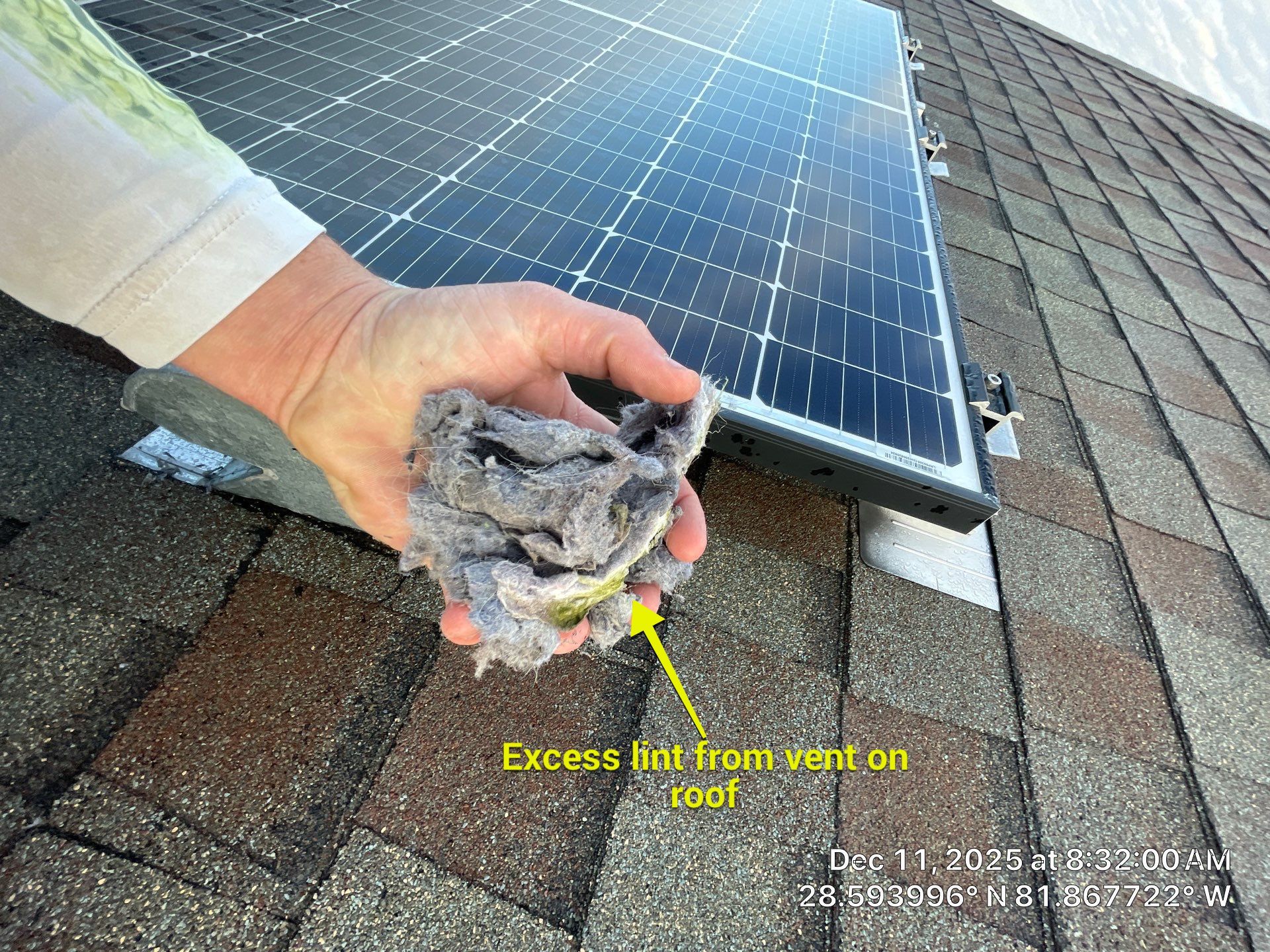 Our team performed a dryer vent cleaning at a home in Groveland, where the rooftop exhaust vent showed a substantial buildup of lint. This type of accumulation can restrict airflow and increase fire risk if left unaddressed. We used our high-pressure, compressed air system to thoroughly remove lint, debris, and any nesting materials from the entire exhaust line. This process restores proper airflow and enhances dryer efficiency, helping reduce energy costs. Before-and-after photos were provided to demonstrate the effectiveness of our cleaning method. Since most Florida homes vent through the roof, we recommend annual dryer vent cleaning to maintain safety, improve performance, and prevent costly issues.