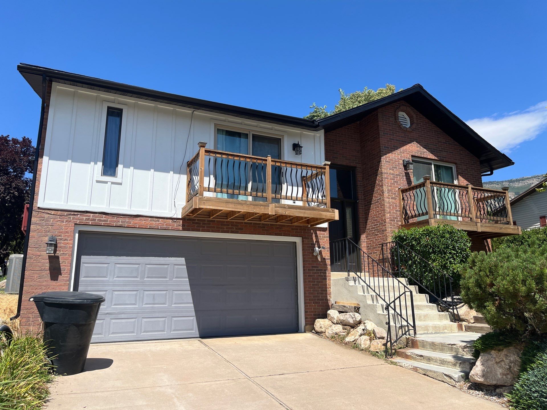 Stunning exterior update in North Ogden featuring custom architectural details and striking color contrasts. We upgraded specific walls and outdoor living areas with premium fiber cement for a modern, high-end look. * Main Siding: James Hardie Board & Batten in Arctic White. Special Features: Custom chimney wrapped in James Hardie Enhance wood-tone lap siding. * Trim & Accents: Bold contrasting trim in Iron Gray. * Additional Upgrades: Installed new Aluminum Perforated Soffits and Aluminum Fascia wrap in custom Black. Special Features: Custom chimney wrapped in James Hardie Enhance wood-tone lap siding.
