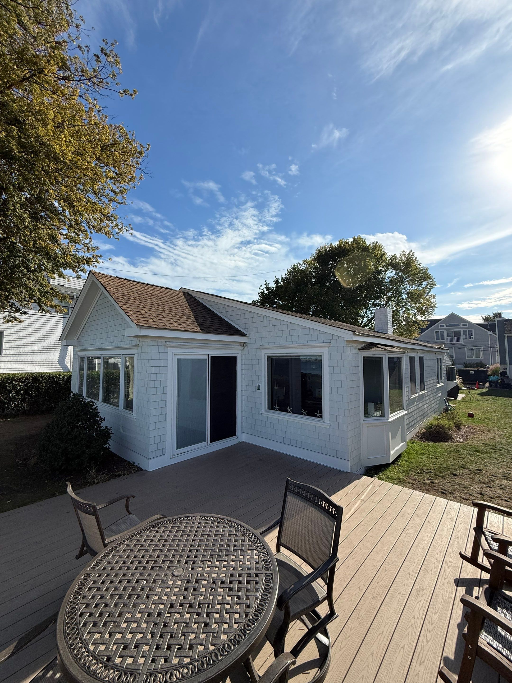 Waterfront home transformed with new James Hardie Plank and Shingle/Shake. Detailed PVC trim moldings with copper flashing accents and new copper gutters.