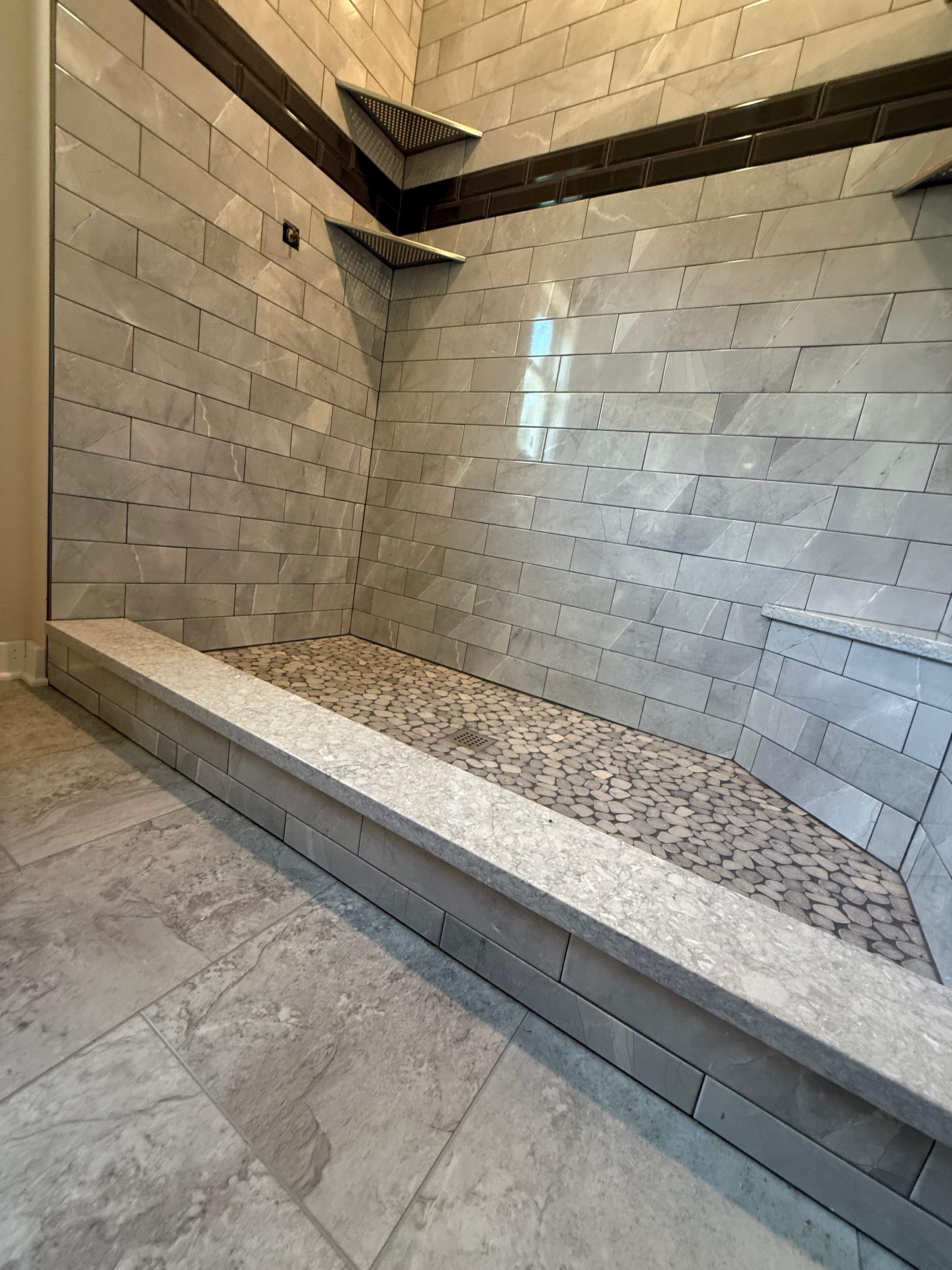 For this new home build, we completed a beautiful bathroom tile installation including a custom shower and new floor tile. The shower features a pebble pan finished with dark grout for added contrast and texture, along with a convenient corner bench and corner shelves for everyday comfort and storage. The result is a clean, durable space with a high-end feel—perfect for a brand-new home.