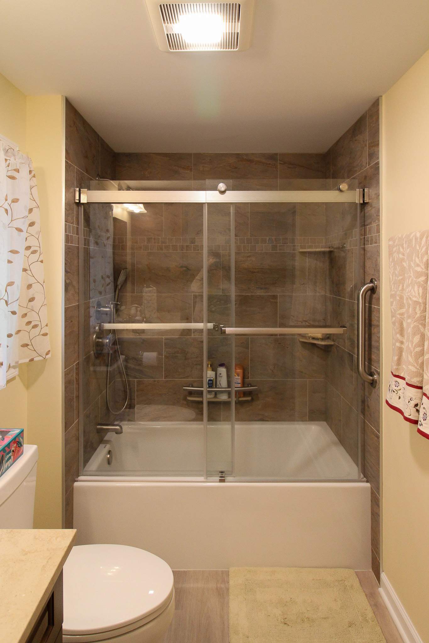 Tub, Waypoint Cabinets, Solid Surface Countertop, Brushed Nickel Fixtures, LVT Flooring, Grab Bar Shelf, corner caddies, Glass Shower Door, Bathroom Remodel