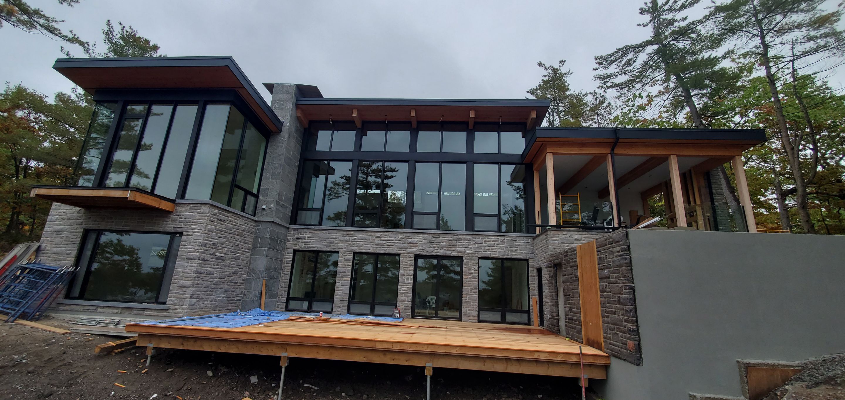 This new home construction project included a full roofing and exterior trim package built for a clean finish and long-term performance. We installed a 24 ga standing seam metal roof using 16” panels in Jet Black Textured to match the modern design and deliver a low-maintenance roof system. We also completed the flat roof areas with a two-ply modified bitumen system to ensure a durable, watertight assembly. To finish the exterior properly, we installed the full soffit, fascia, and eavestrough package so every edge, transition, and drainage point was sealed and built to last.