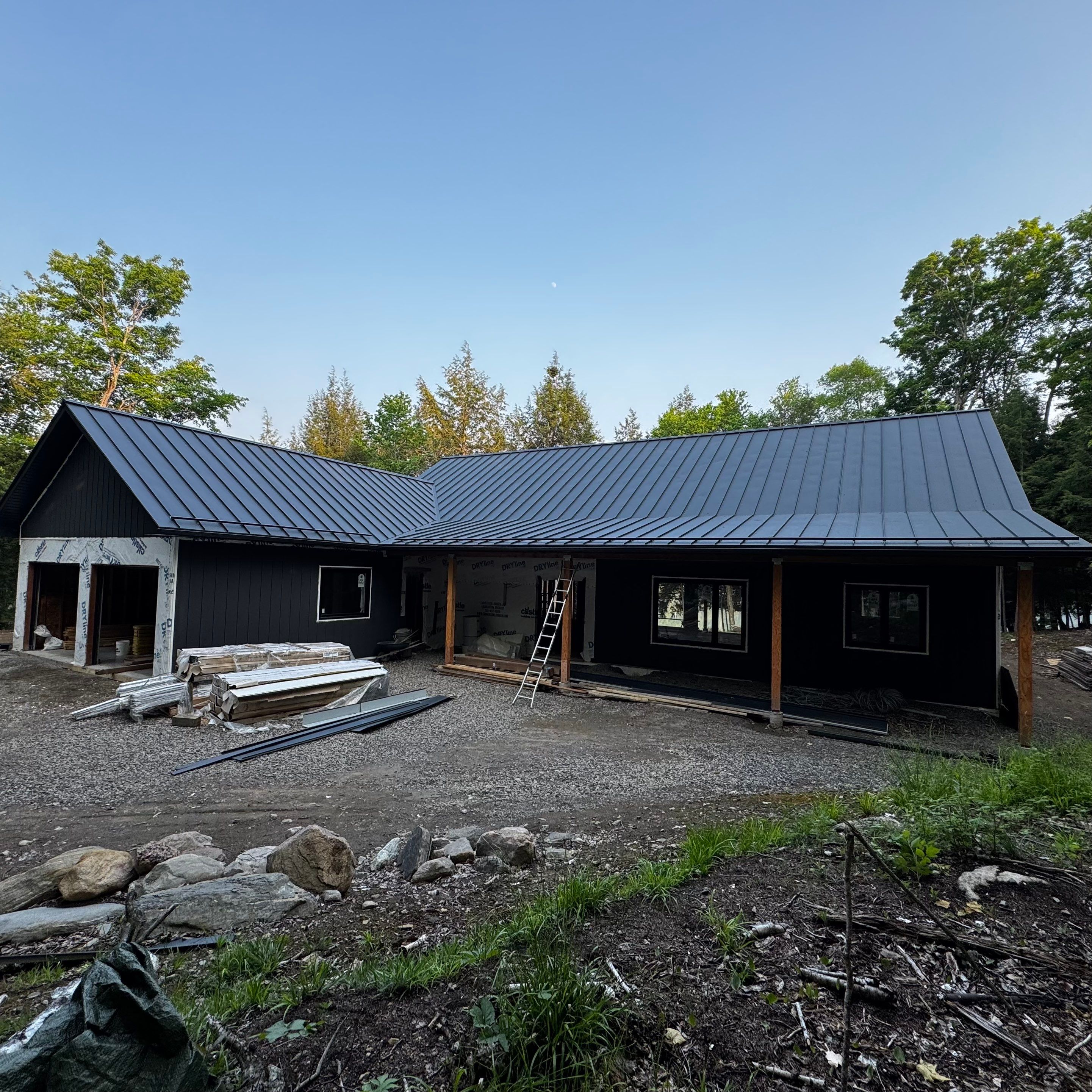 This new construction project combined a bold metal roof with a full exterior package built for clean lines and long-term performance. We installed a 20” metal panel roof in TEX Dark Graphite. For the walls, we installed Celect siding in Wrought Iron for a sharp, modern look with low upkeep. To match the architecture, we added Cascadia Corten Steel on the gables and columns. We finished the edges with Kaycan fascia and eavestrough in Rustic Granite, and Kaycan Urbanix specialty soffit in Gothic Grey. For protection and maintenance, we included Leafguard and an S5 snow guard system to control snow release and keep key areas safer.