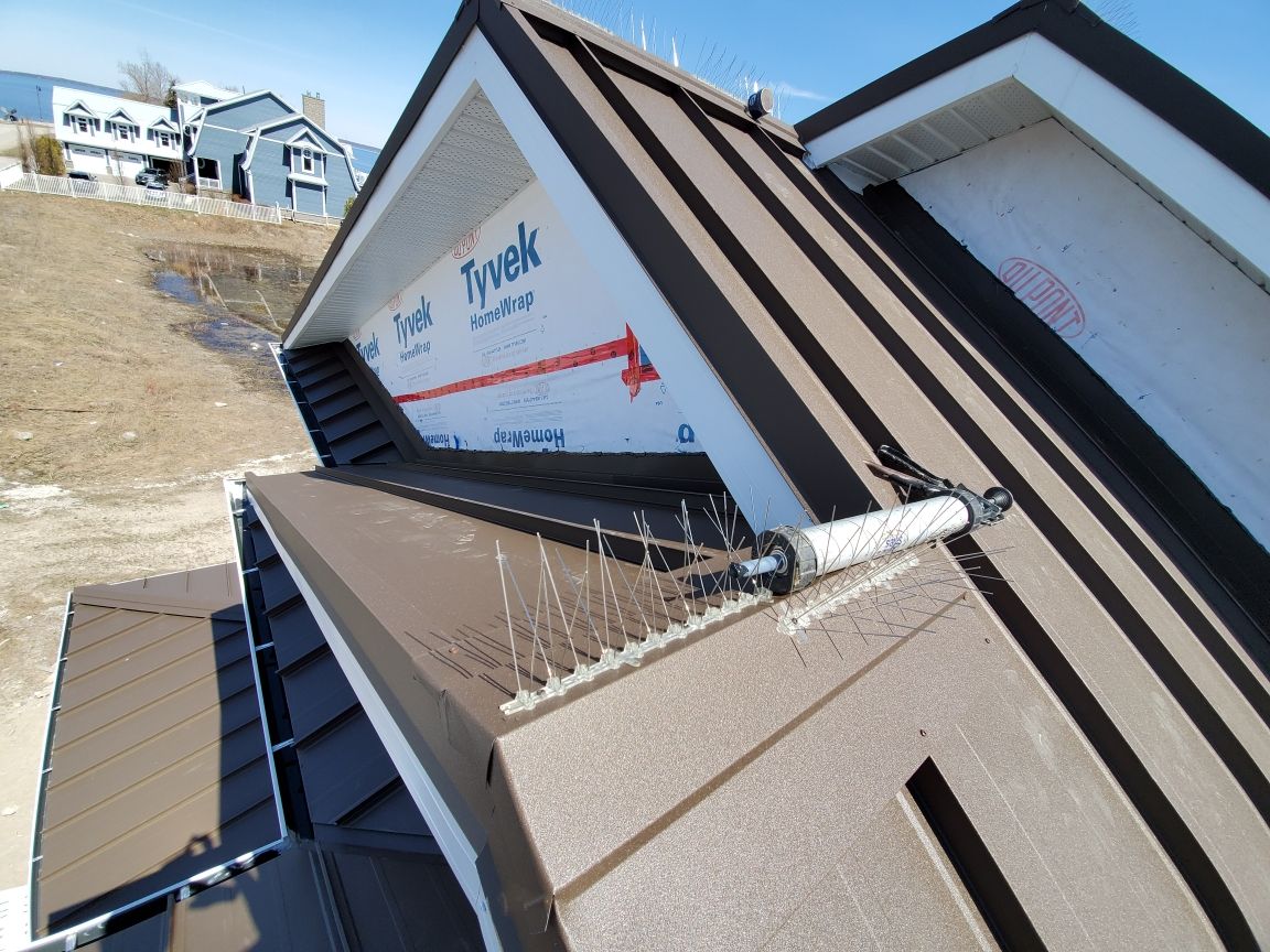 This new home construction project included a full roofing and exterior trim package built for long-term performance and a clean finish. We installed a 24 ga standing seam metal roof using 16” panels in Textured Brown, giving the home a warm, high-end look with low maintenance. To protect key areas from sliding snow, we added an S5 snow guard system. We completed the exterior with new soffit, fascia, and eavestrough for proper ventilation, sharp edges, and reliable drainage.