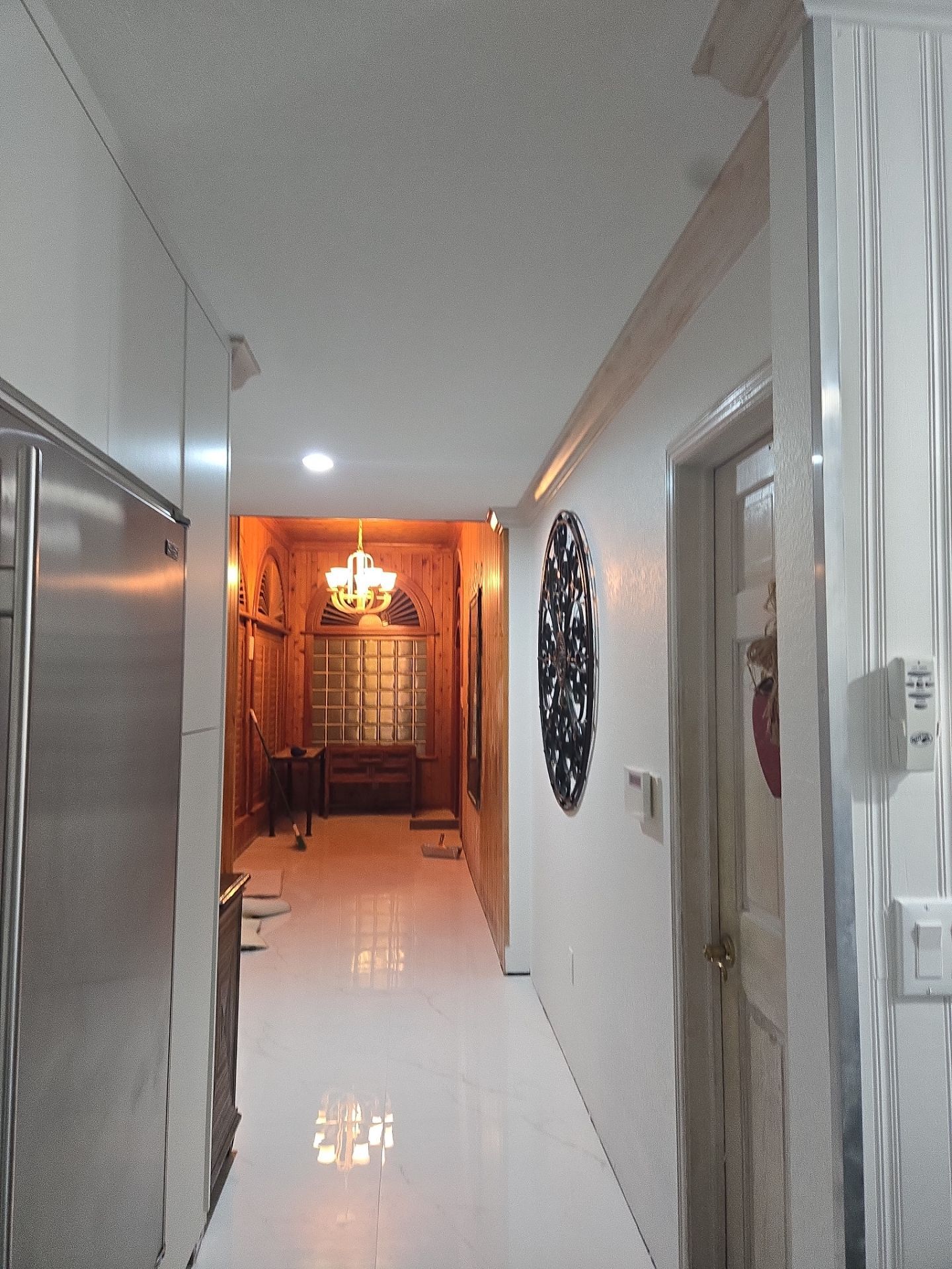 In this residential interior project, our crew painted walls, ceilings, baseboards, and crown molding throughout the common areas of this Miami home, including the family room, kitchen, dining room, and living room with hallway. Wood walls in the living room and hallway were prepped, puttied, and painted. The foyer baseboard was stain-matched to the existing wood walls and finished with two coats of varnish. Wall trim sections were removed, patched, and textured for a clean look. The master bathroom was recaulked with almond-colored caulking, all with careful protection of furnishings throughout.