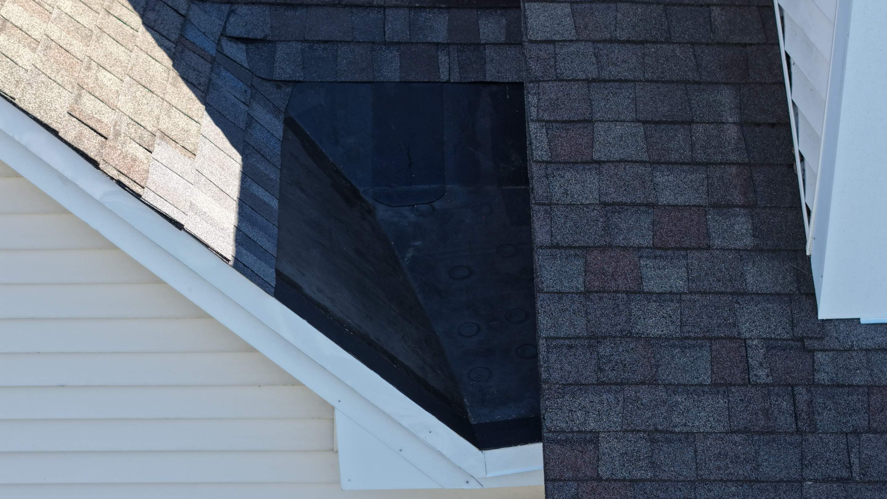 This project addressed a high-risk roof-to-wall transition where a valley was directing heavy water flow into a low-slope section with no proper drainage. Over time, debris buildup and winter conditions led to water backup and active leaking. Instead of performing a temporary repair, we redesigned the system. The affected shingle area was removed, and the section was converted into a fully sealed EPDM rubber roofing system. We extended the membrane up the wall transition and created positive pitch to direct water away from the structure. This solution eliminates water pooling, prevents ice dam formation, and provides long-term waterproof protection in an area where shingles alone would continue to fail.