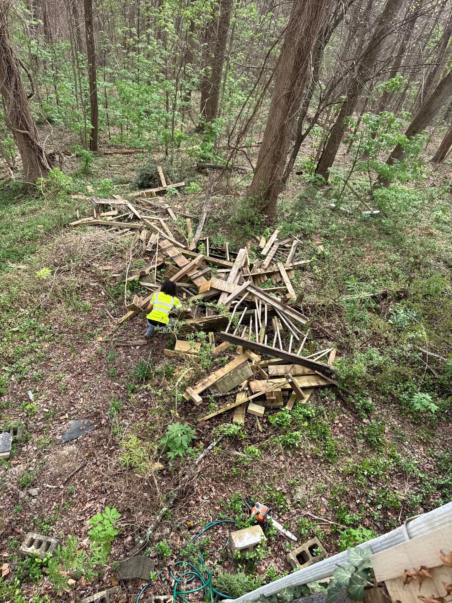 Job Description – Construction Debris Cleanup & Hauling Jones Empire Service Experts was called in to perform a full debris cleanup and hauling service following a porch construction project where excess wood and construction material had been improperly disposed of down a hillside. Due to the location and terrain, the debris was not accessible by equipment and required manual recovery and transport. Our crew worked to gather all discarded material from the hillside, carrying and staging it for removal. Once collected, all debris was hand loaded into a dump trailer and dump truck, ensuring efficient removal from the property. Larger pieces of wood were broken down as needed to allow for safe handling and proper loading. After removal, the area was thoroughly cleaned to restore the property to a safe, clean, and presentable condition, eliminating potential hazards and preventing further environmental impact. This project required: • Manual labor due to limited equipment access • Coordination of hauling equipment for efficient removal • Proper disposal of construction debris • Attention to detail in restoring the site This job highlights our ability to handle difficult access cleanup projects and ensure proper debris removal, even in challenging terrain.