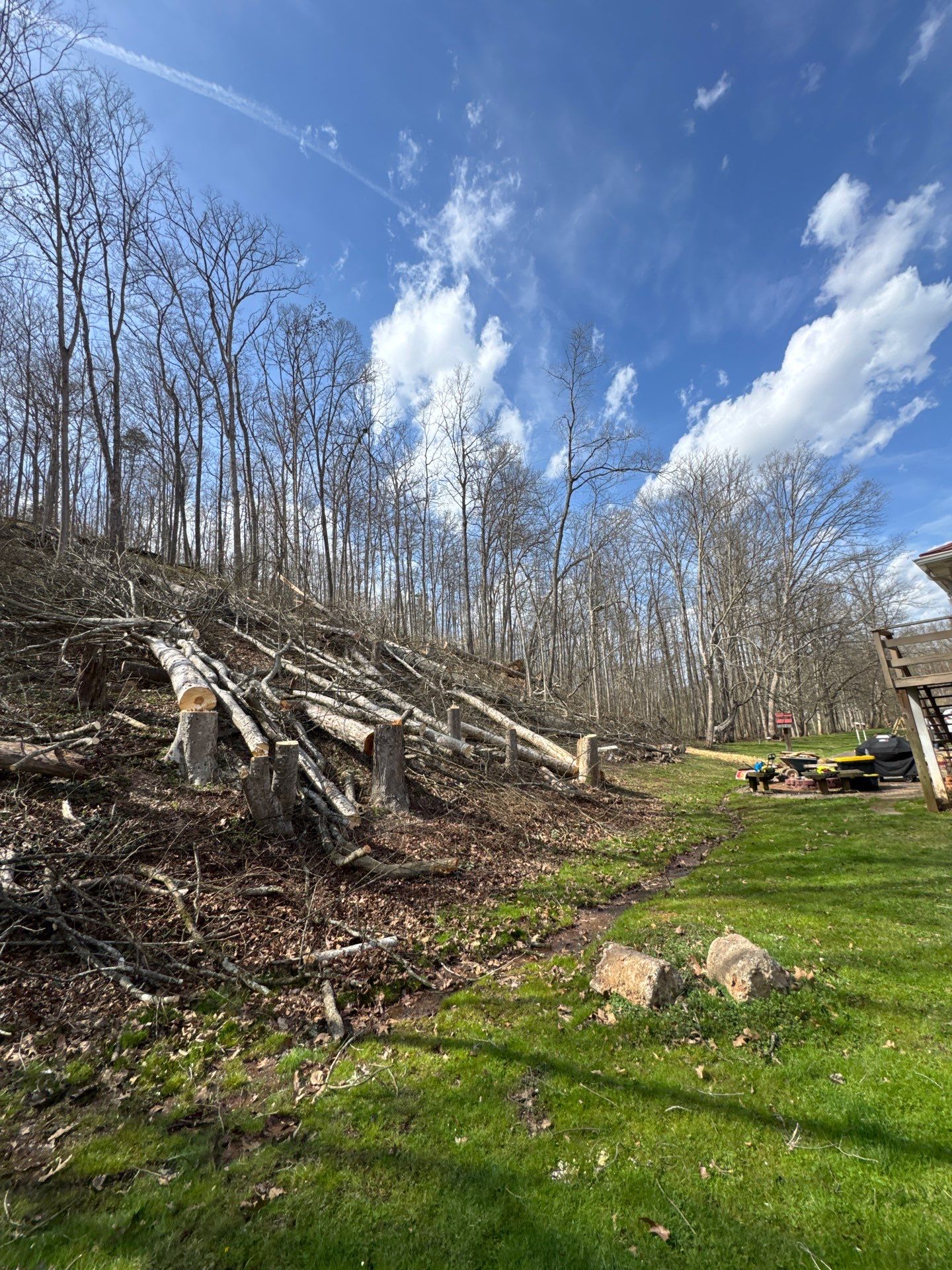 Jones Empire Service Experts was called in following a tree failure that resulted in significant impact to a residential structure. After the initial incident, multiple additional trees remained on the hillside, leaning toward the home and creating an ongoing safety concern for the homeowner and neighboring property.
