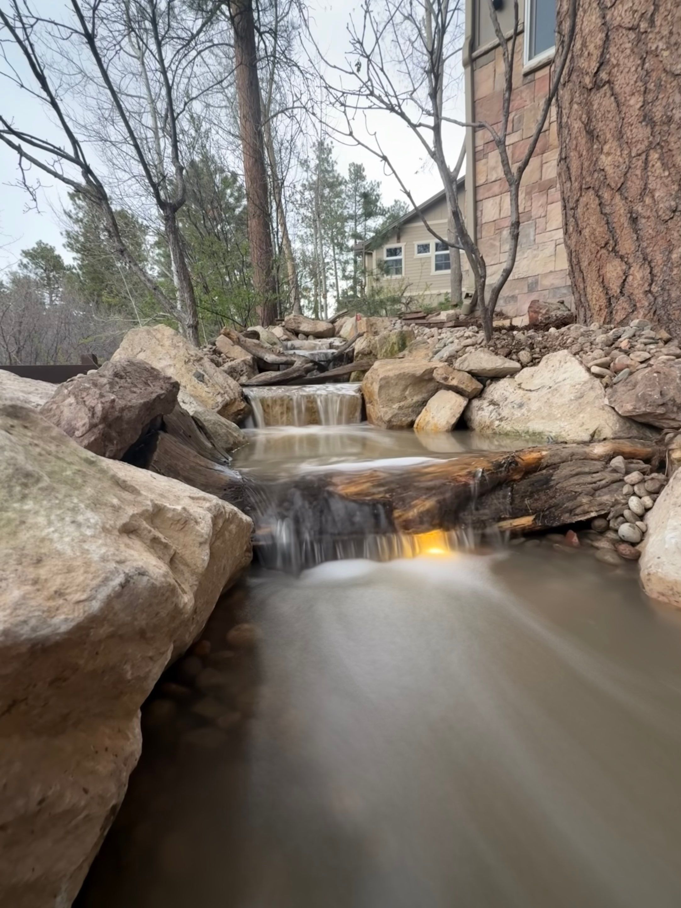 JRM landscape & designThis stunning pondless waterfall cascades gracefully along a towering pine tree that shelters a massive beehive. Designed with nature in mind, the feature blends beauty and functionality — built sturdy enough for bears, deer, and turkeys to safely enjoy while maintaining a serene, natural flow that enhances the entire landscape.
