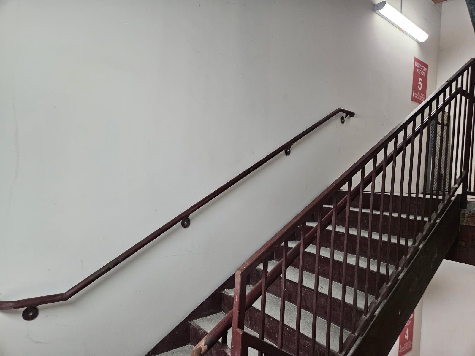 - Received call about handrail that fell in stairwell at complex. Handrail was found at the fourth floor leading up to the fifth floor - Prep area where original holes were located at - Mounted handrail securely to the wall with brackets anchored into the wall structure. - Installed handrail to maintain proper height and continuity along the stairs. - Completed minor wall touch-up related directly to handrail installation. - Confirmed handrail is secure and functional upon completion. - Clean area after repairs were made