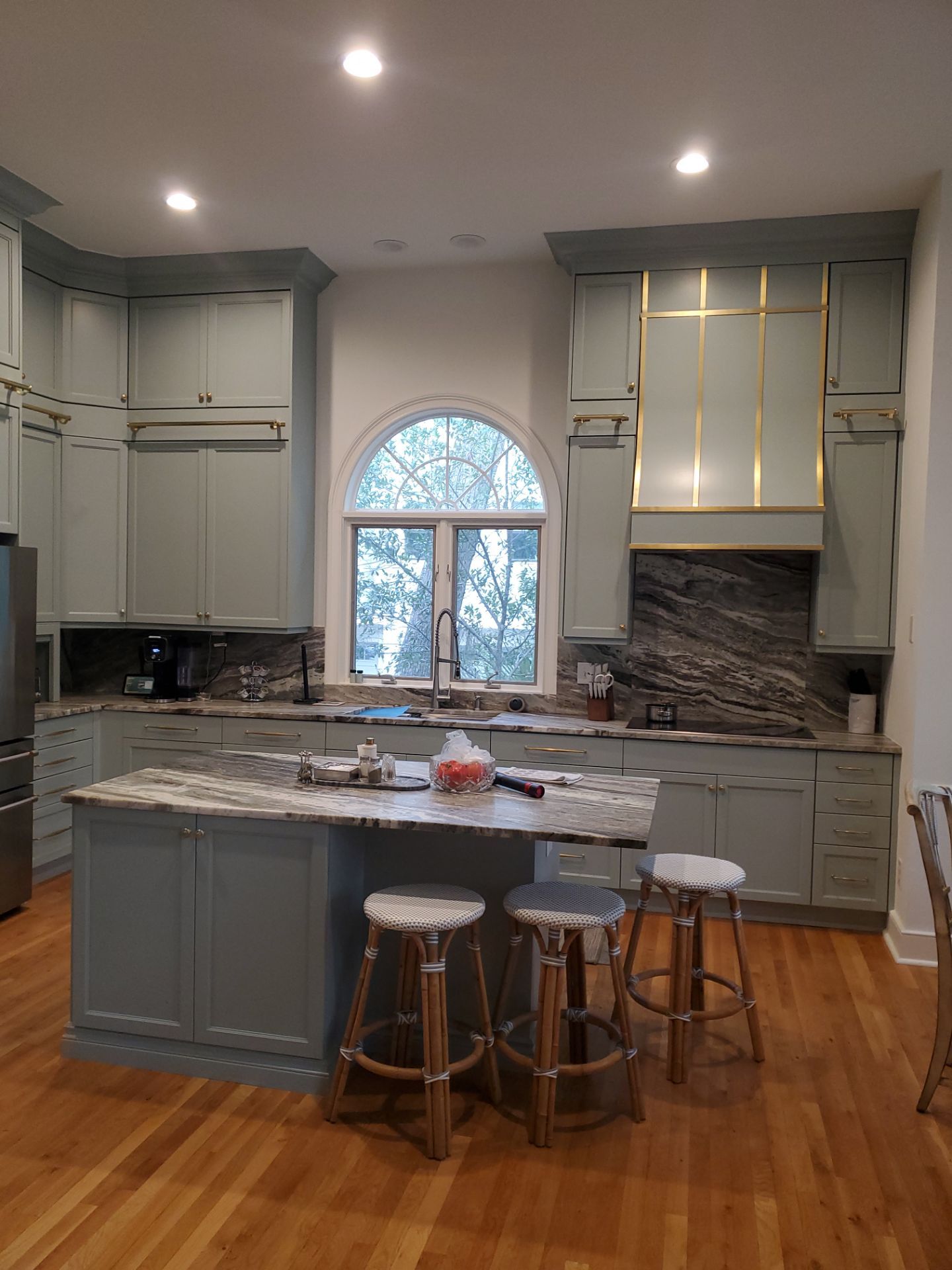Custom cabinets stacked to the ceiling, custom hood vent, ladder rail and all doors and boxes sprayed.