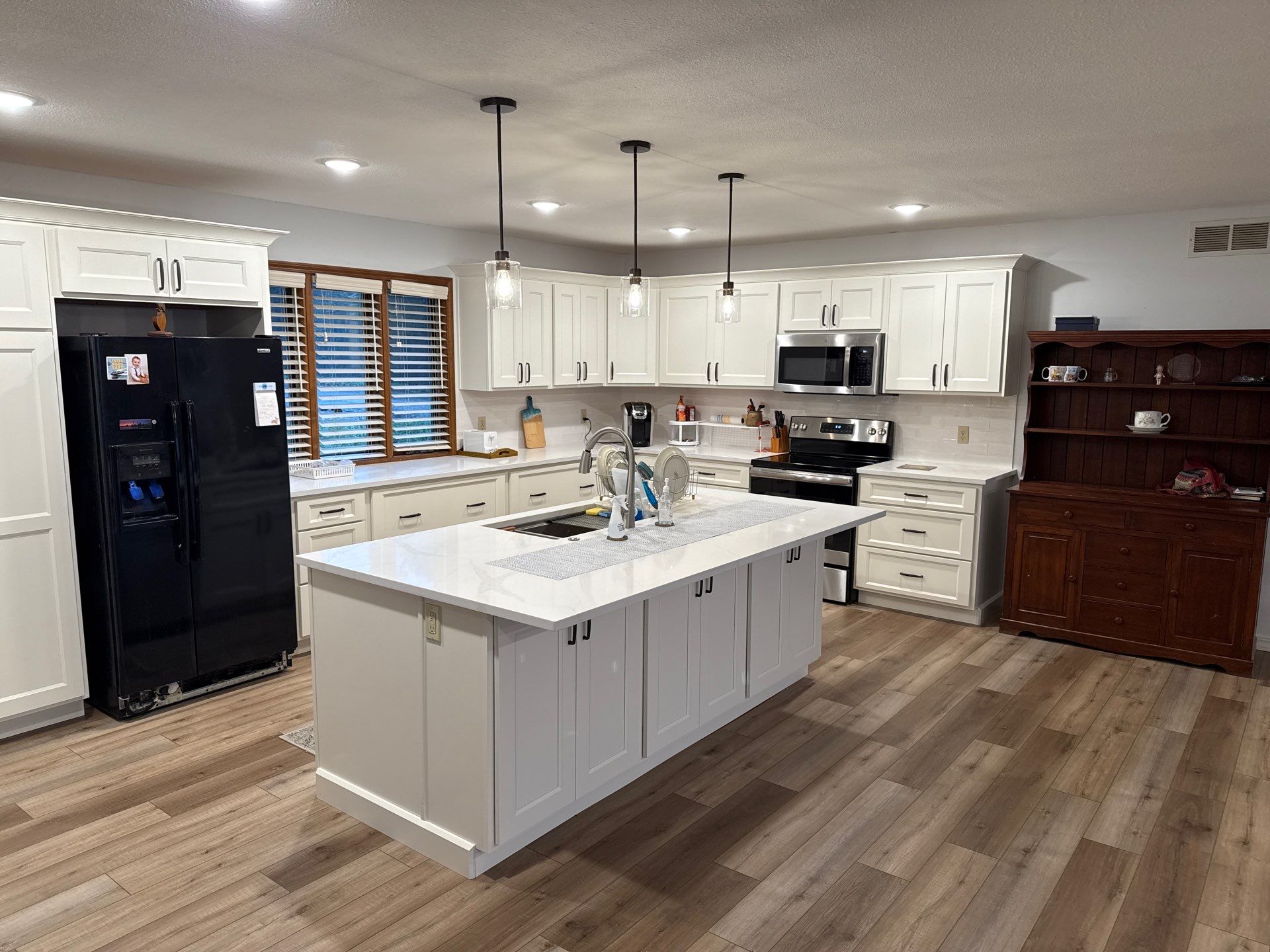 This renovation involved removing a dark, dank view blocking galley kitchen. We opened up the entire view from the front door to the back deck looking out over Table Rock Lake. A very functional L-shaped kitchen with island was relocated to the front of the home which opened up the entire room. Call today for your in-home consultation.