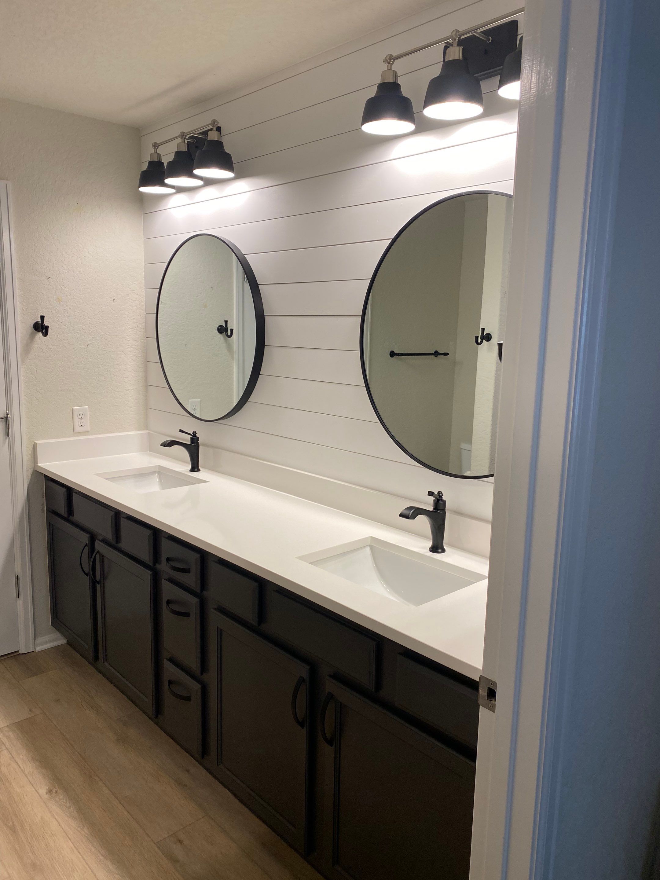Moody navy painted cabinets, shiplap walls, round vanity mirrors and classic subway tiles bring interest and flavor to this once-boring bathroom.
