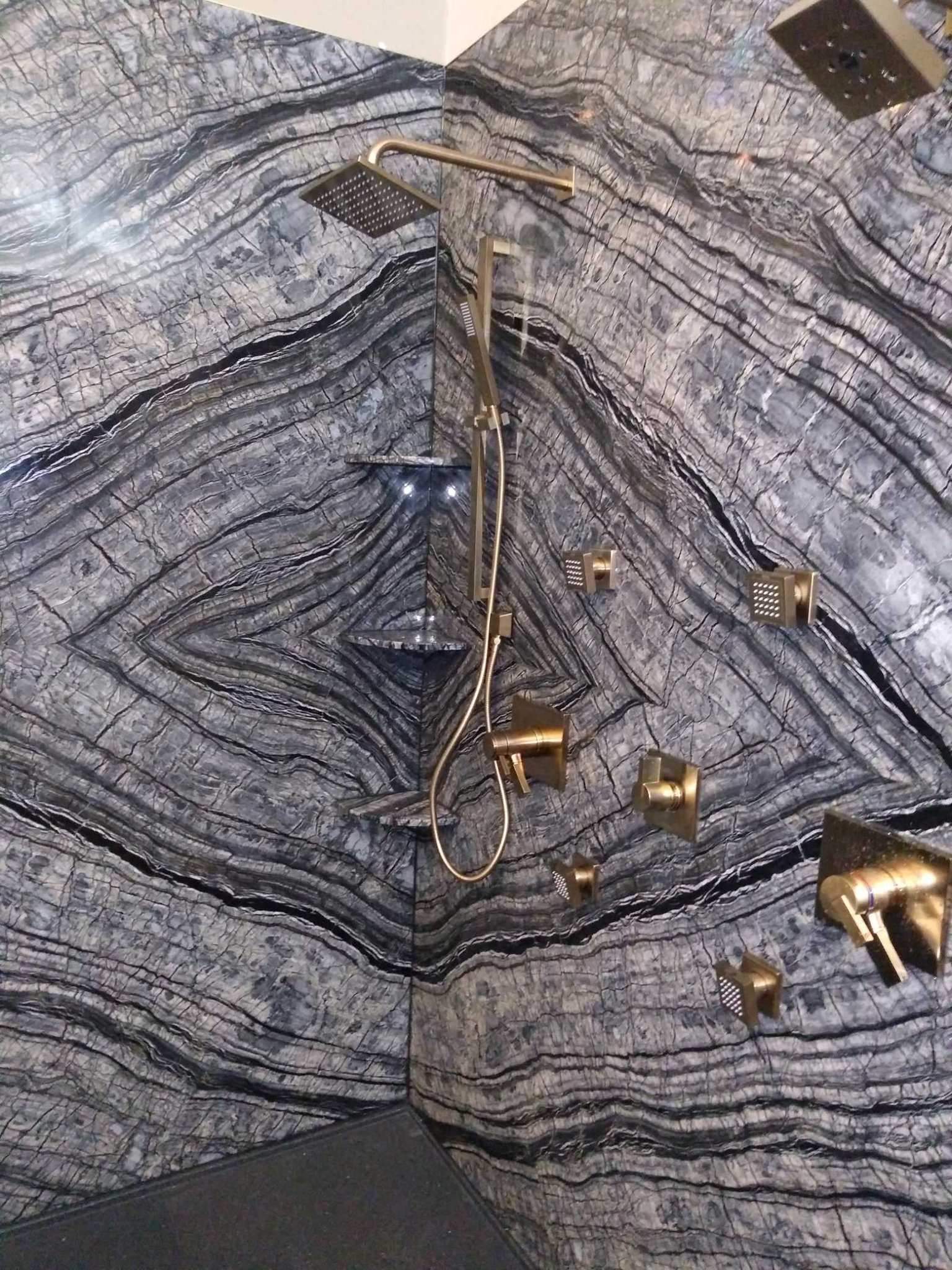 This luxurious bathroom remodel is a true masterpiece, combining elegance with bold design elements. The highlight of the space is the stunning book-matched natural stone shower walls, which create a breathtaking focal point with their unique patterns and rich textures. These exquisite walls are complemented by sleek, dark cabinetry that adds a touch of modern sophistication. The cabinetry offers ample storage, ensuring both style and functionality. To complete the glamorous look, the bathroom features gleaming gold fixtures that infuse the space with warmth and opulence. This combination of textures and colors results in a bathroom that is both statement-making and serene, offering a spa-like retreat within the home.