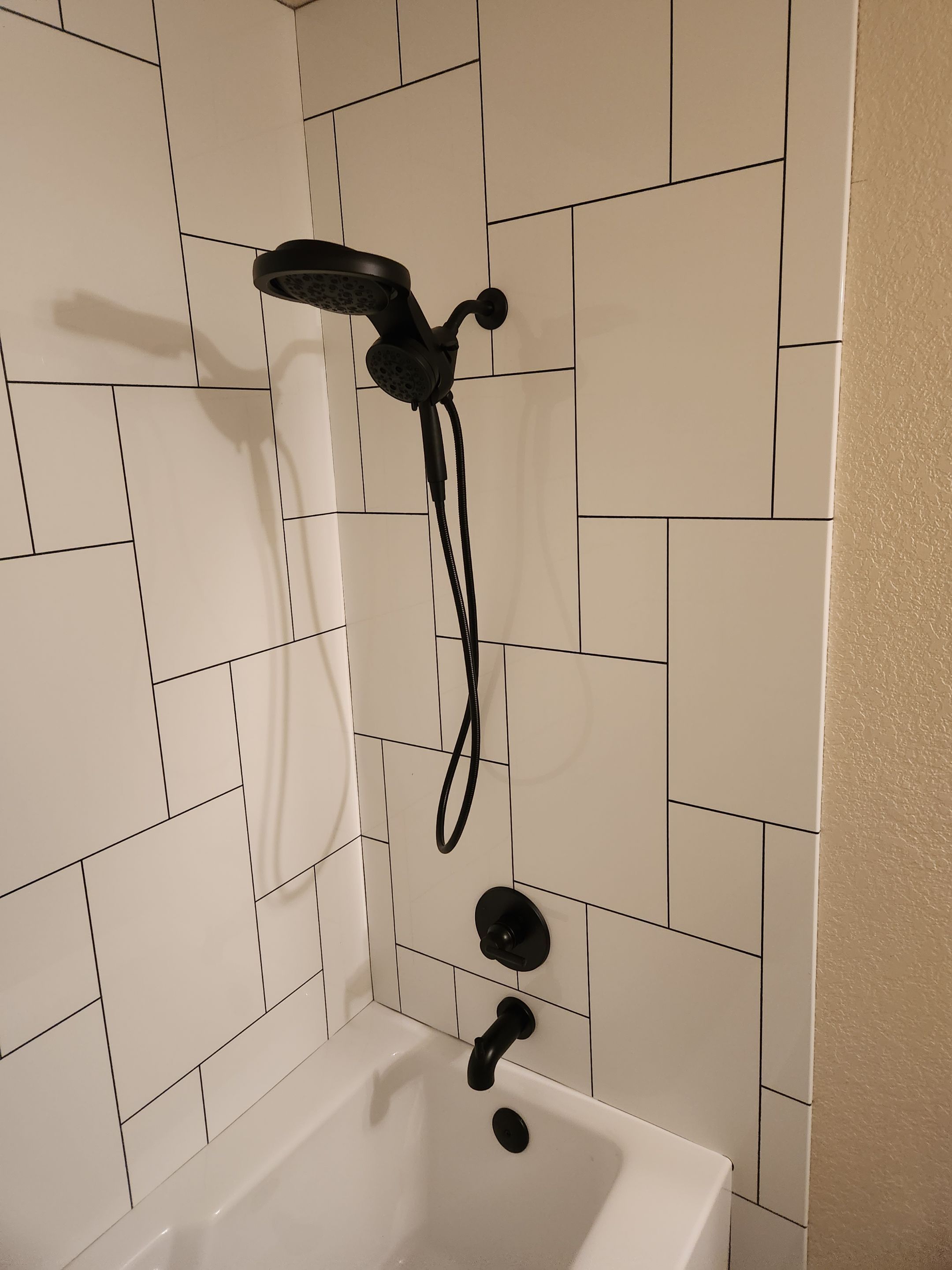 Matte Black Delta plumbing fixtures, Delta In2ition Shower Head, Shower Remodel