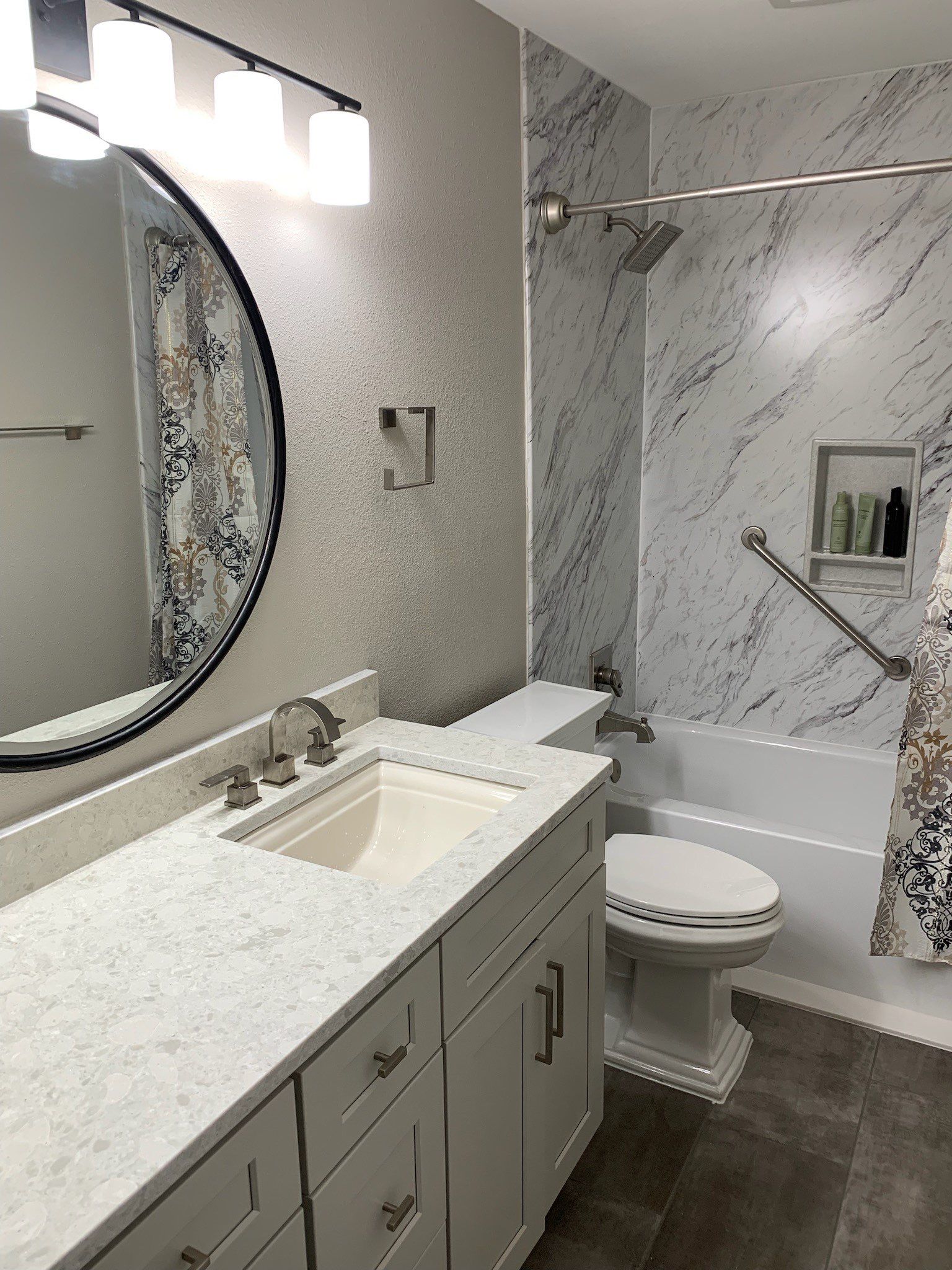 Out with the old cultured marble countertops and moldy tiles and in with an updated look, including low-maintenance quartz countertops and Wilsonart Wetwall shower walls. Swapping out the large unframed, vanity mirror for a large framed round mirror provides a simple update with a big impact.