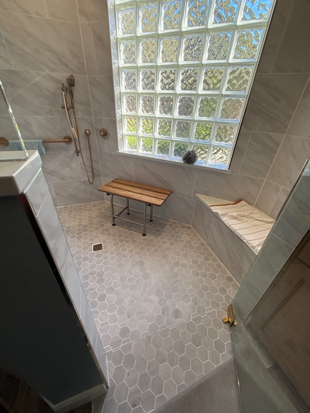For this stunner, we removed an oversized, outdated garden tub and cramped shower enclosure to make way for a spacious and luxurious walk-in shower. The new design maximizes both functionality and style. The fold-down teak bench adds comfort and convenience, perfectly positioned next to a handheld shower. The new walk-in shower is the ultimate space for both beauty, relaxation, and accessibility.