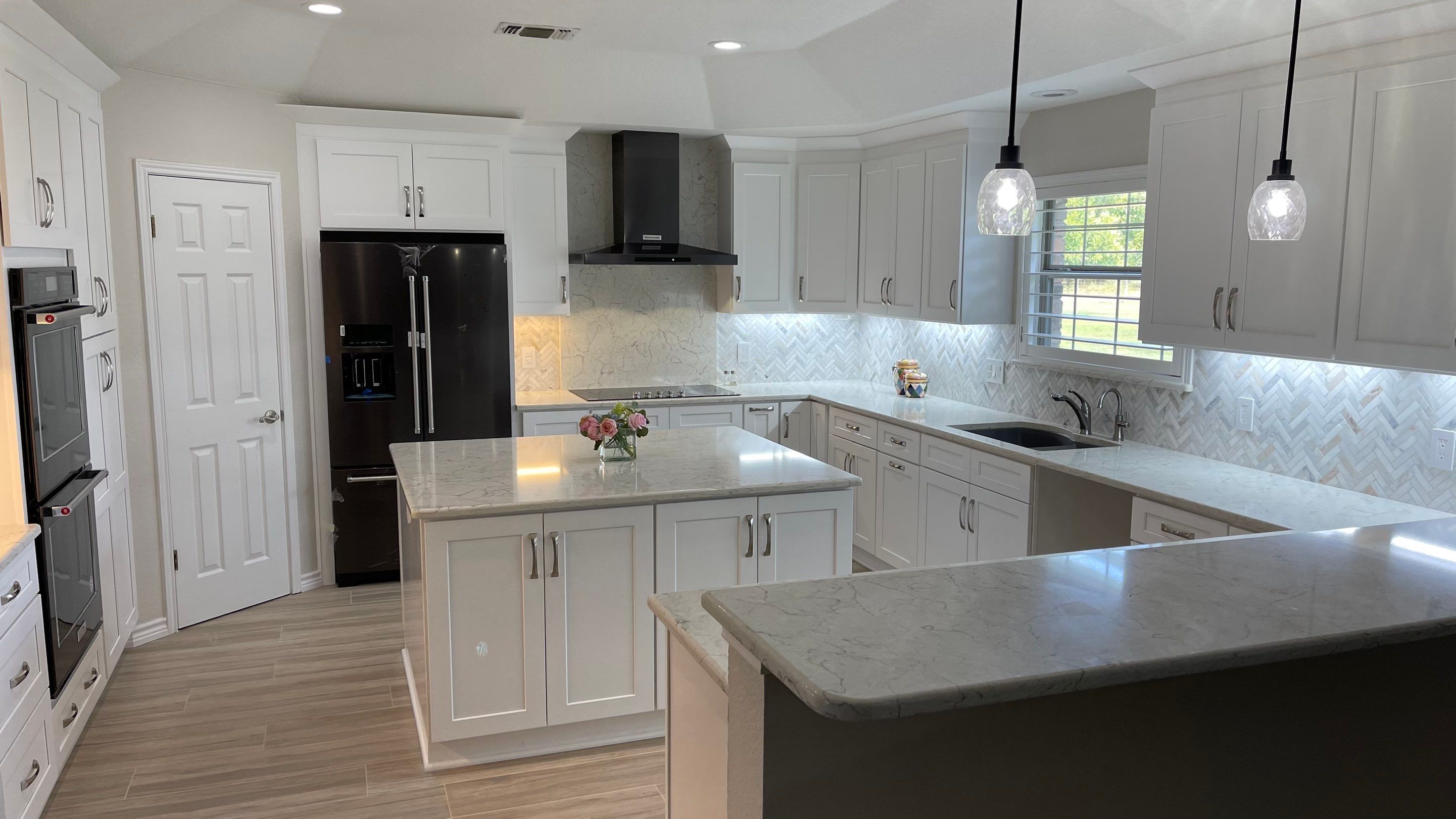 Out with the old and in with the new! Gone is the burgundy striped wallpaper, honey oak cabinets, and blue countertops. Fresh oak floors paired with the lighter colored quartz countertops brought so much light and life to this kitchen!