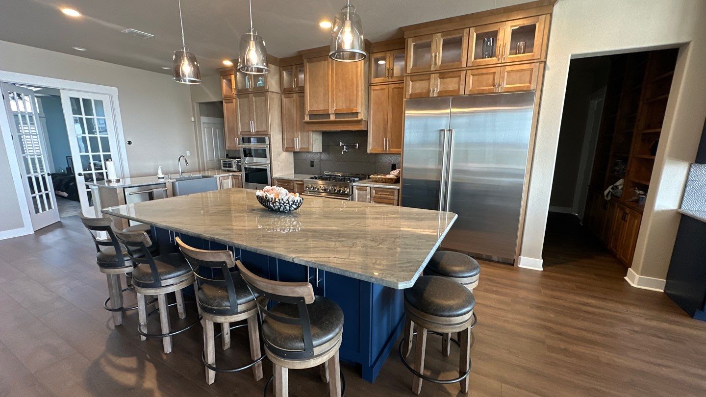 This Spring Branch kitchen remodel transformed an early-2000s kitchen with dark granite countertops, hickory cabinets, and an ornate vent hood into a clean, modern space while keeping the original footprint intact. We paired toffee-stained maple cabinets with a bold navy kitchen island and matching beverage station, neutral quartzite countertops, and a striking statement backsplash to brighten and modernize the space. The new custom range hood was shifted to accommodate a much larger Sub-Zero refrigerator, improving both flow and functionality. Additional upper cabinets and smart kitchen storage solutions, including a corner lazy Susan and built-in space cabinets flanking the range, maximize storage and everyday efficiency. This project is a perfect example of how thoughtful custom cabinetry and design can elevate a kitchen without changing its layout.
